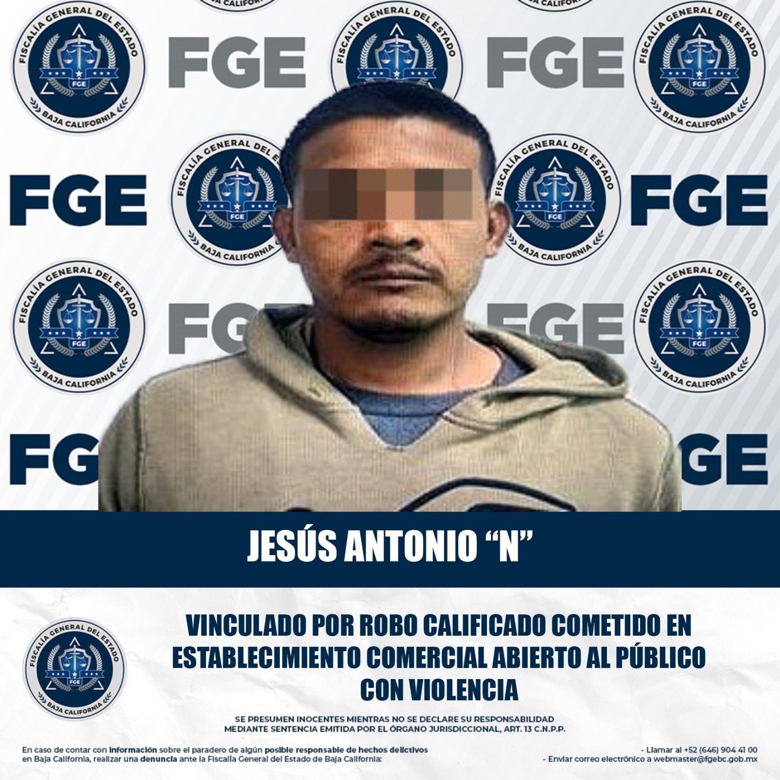 MEXICALI, BAJA CALIFORNIA. - La Fiscalía Regional de Mexicali, a través de la Unidad de Investigación de Delitos de Robo Oriente, obtuvo la vinculación a proceso de Jesús Antonio “N”, esto por su presunta participación en el delito de robo calificado cometido en establecimiento comercial abierto al público con violencia.