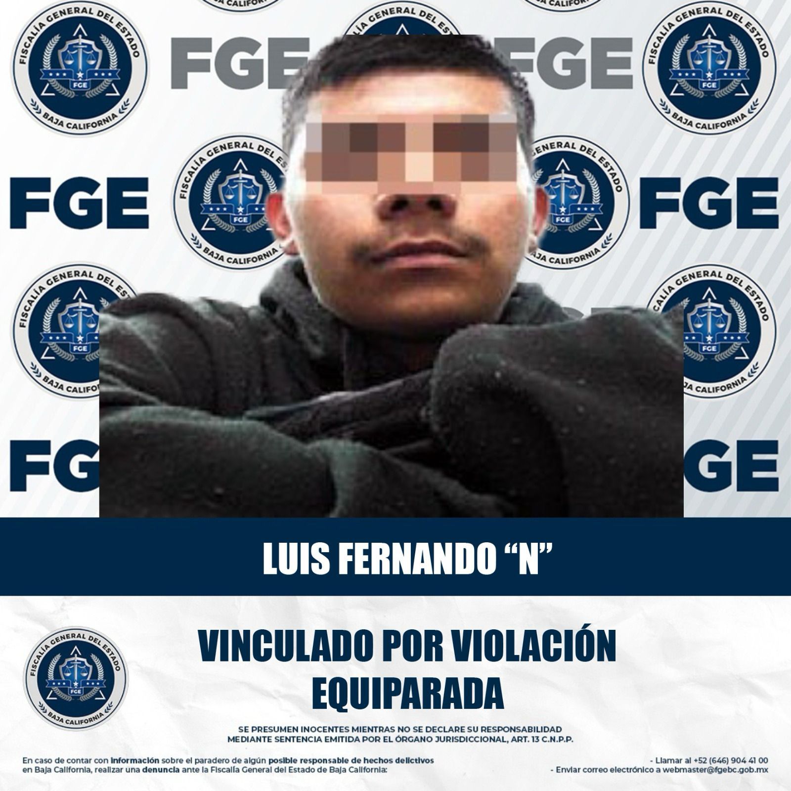MEXICALI, BAJA CALIFORNIA. - La Fiscalía Regional de Mexicali, a través de la Unidad de Investigación Foránea de Ciudad Guadalupe Victoria, obtuvo la vinculación a proceso de un hombre acusado de violación.