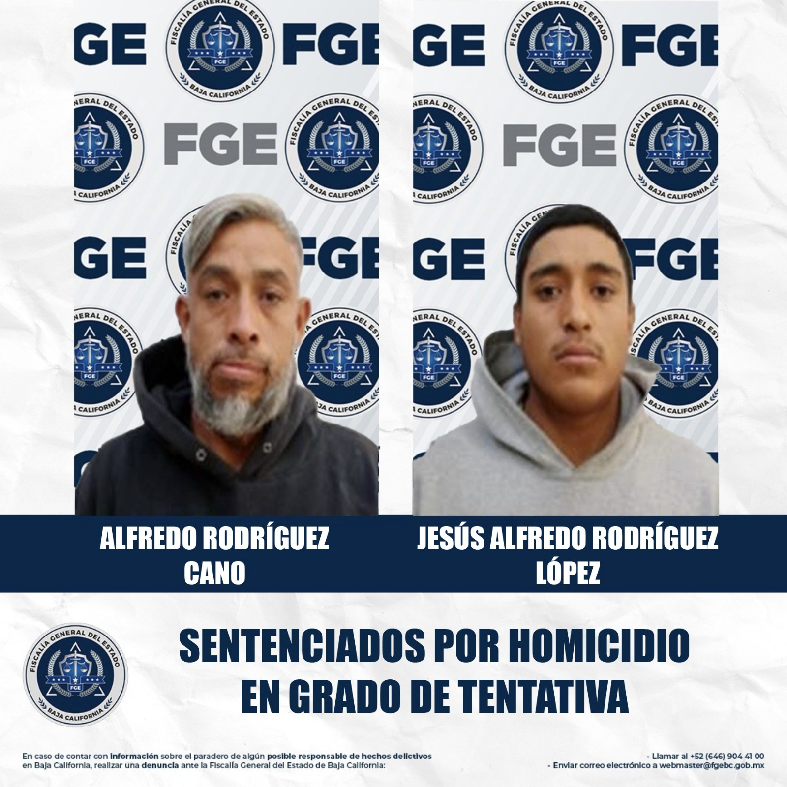 MEXICALI, BAJA CALIFORNIA. - La Fiscalía Regional de Mexicali, a través de la Unidad de Investigación de Delitos con Detenidos Poniente, obtuvo sentencia condenatoria contra Alfredo Rodríguez Cano y Jesús Alfredo Rodríguez López, por su responsabilidad en el delito de homicidio calificado en grado de tentativa.