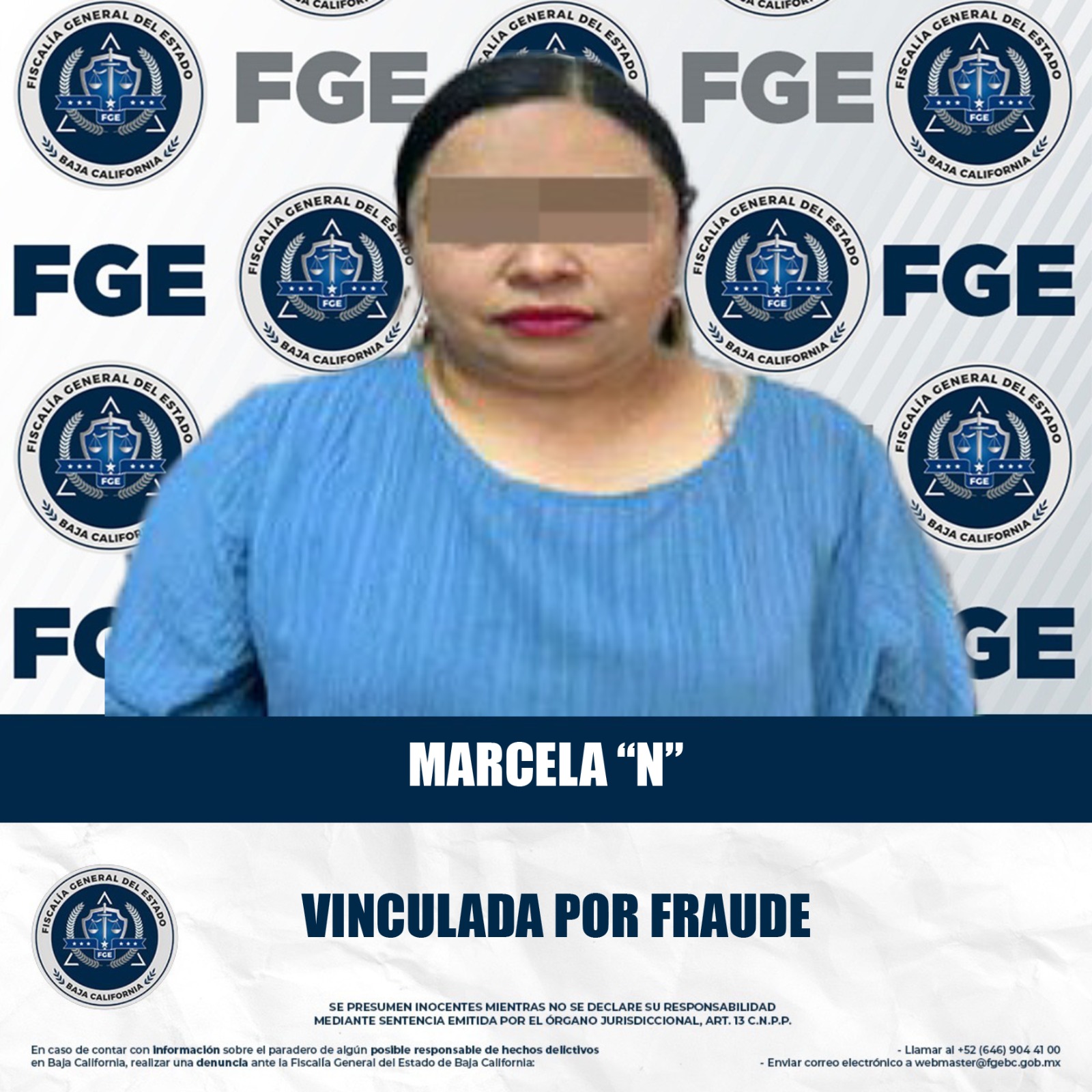 MEXICALI, BAJA CALIFORNIA. - La Fiscalía Regional de Mexicali obtuvo una nueva vinculación a proceso en contra de Marcela “N”, mediante los datos de prueba presentados por el agente del Ministerio Público, por su presunta responsabilidad en el delito de fraude.