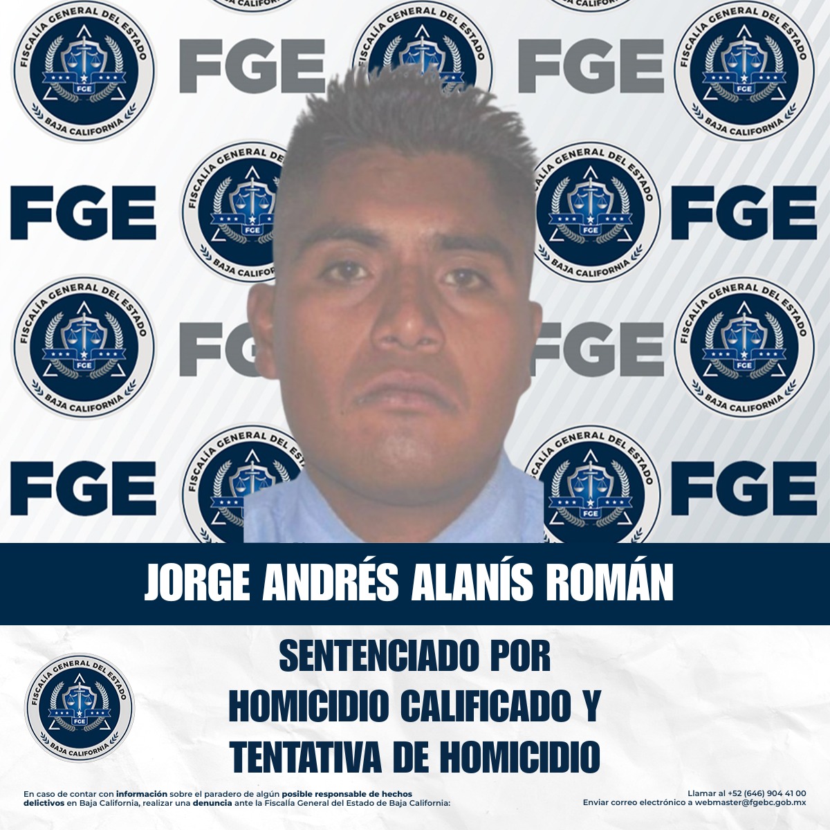 TIJUANA, BAJA CALIFORNIA. - La Fiscalía General del Estado de Baja California informa que, gracias al trabajo especializado de la Fiscalía en Delitos Contra la Vida y bajo el compromiso firme de su titular, la Dra. Ma. Elena Andrade Ramírez, de llevar ante la justicia a quienes atentan contra la integridad y la vida de las personas, se obtuvo una sentencia condenatoria en contra de Jorge Andrés Alanís Román por los delitos de homicidio calificado con ventaja y homicidio calificado con ventaja en grado de tentativa.