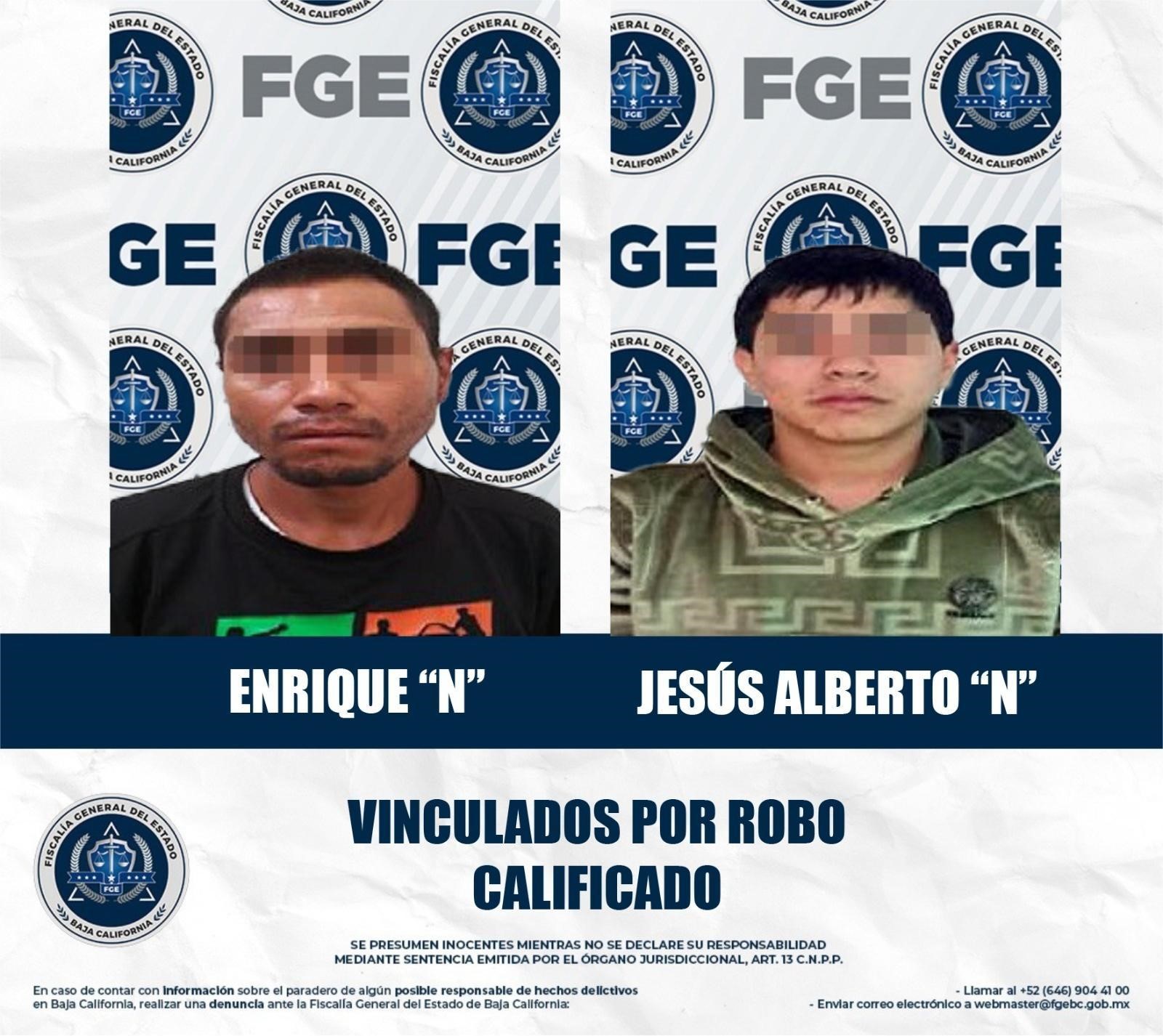 MEXICALI, BAJA CALIFORNIA. - La Fiscalía Regional de Mexicali, a través de la Unidad de Investigación de Delitos con Detenidos Poniente, y Detenidos Oriente, obtuvo la vinculación a proceso de dos hombres imputados por los delitos de robo calificado con violencia y robo calificado cometido por dos o más personas con violencia.