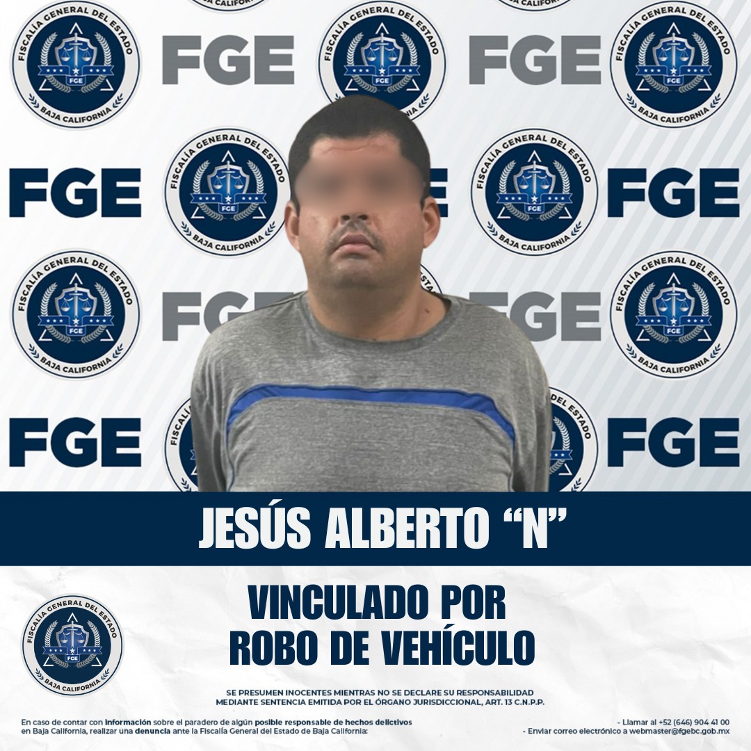 ENSENADA, BAJA CALIFORNIA. - La Fiscalía Regional de Ensenada, a través de la Unidad de Investigación de Robo de Vehículos, logró la vinculación a proceso de Jesús Alberto “N”, por su presunta participación en el robo de una camioneta tipo pick-up, marca Chevrolet modelo 2004.