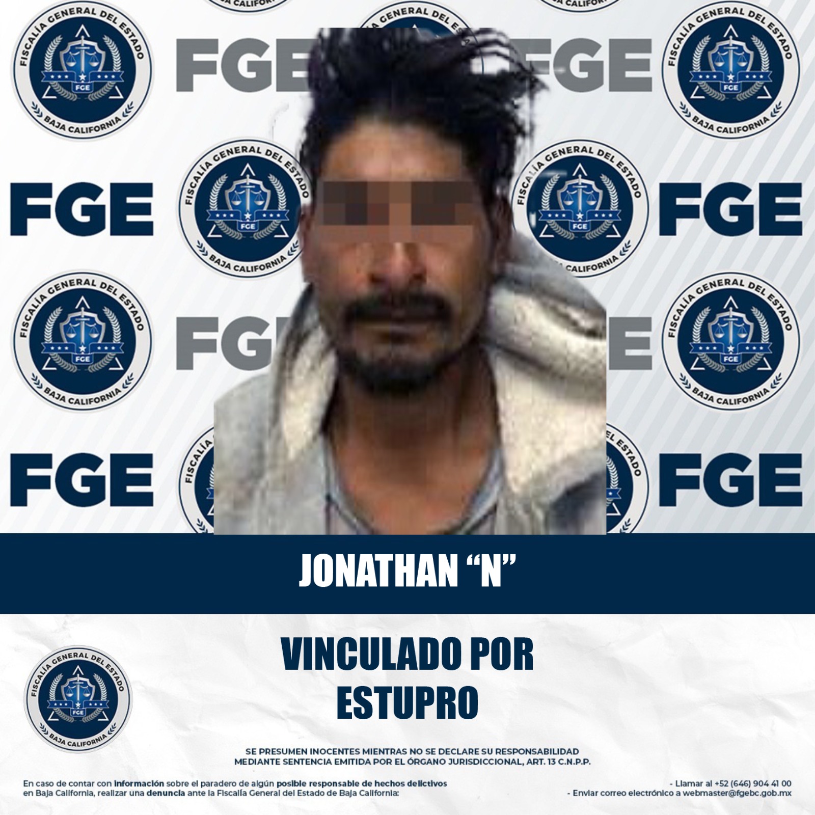 MEXICALI, BAJA CALIFORNIA. - Con base en los elementos de prueba presentados por la Fiscalía Regional de Mexicali, a través de la Unidad de Investigación de Delitos Contra las Personas y su Libertad, un acusado por el delito de estupro fue vinculado a proceso.