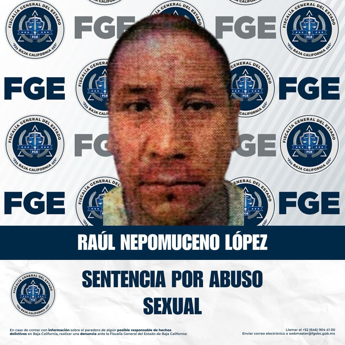 TIJUANA, BAJA CALIFORNIA. – La Fiscalía Regional de Tijuana, a través de la Coordinación de Averiguaciones Previas y Control de Procesos, informa sobre la sentencia condenatoria dictada en contra de Raúl Nepomuceno López, por su responsabilidad en el delito de abuso sexual en agravio de una menor de 14 años.