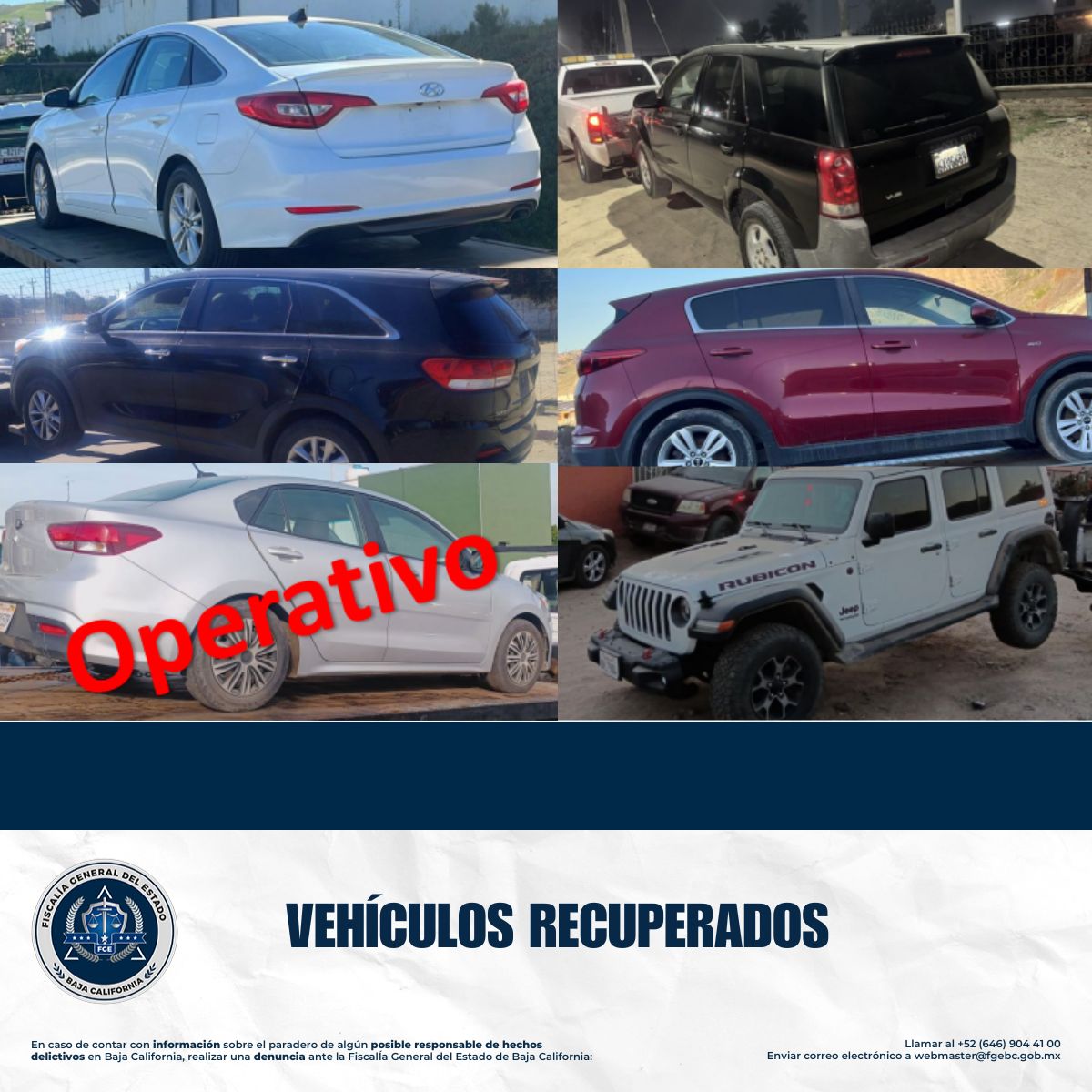 TIJUANA, BAJA CALIFORNIA .- Bajo las instrucciones de la Fiscal General del Estado, Dra. Ma. Elena Andrade Ramírez, la Agencia Estatal de Investigación, a través de la Unidad de investigación Especializada en Robo de Vehículos, informa que 11 vehículos fueron recuperados mediante tareas de investigación en Tijuana durante el periodo del 8 al 14 de diciembre de 2025.