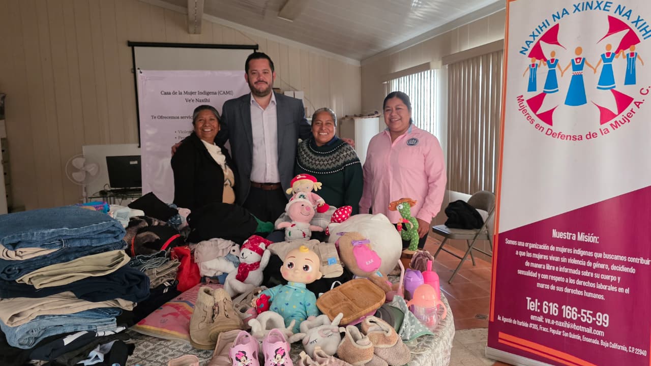 SAN QUINTÍN, BAJA CALIFORNIA. - La Fiscalía General del Estado, encabezada por la Dra. Ma. Elena Andrade Ramírez, realizó una actividad de donación de ropa para mujeres y juguetes para niñas y niños, como parte de las acciones de proximidad social y solidaridad durante las fiestas decembrinas, beneficiando a integrantes de la Casa de la Mujer Indígena Ve´e Naxihi.