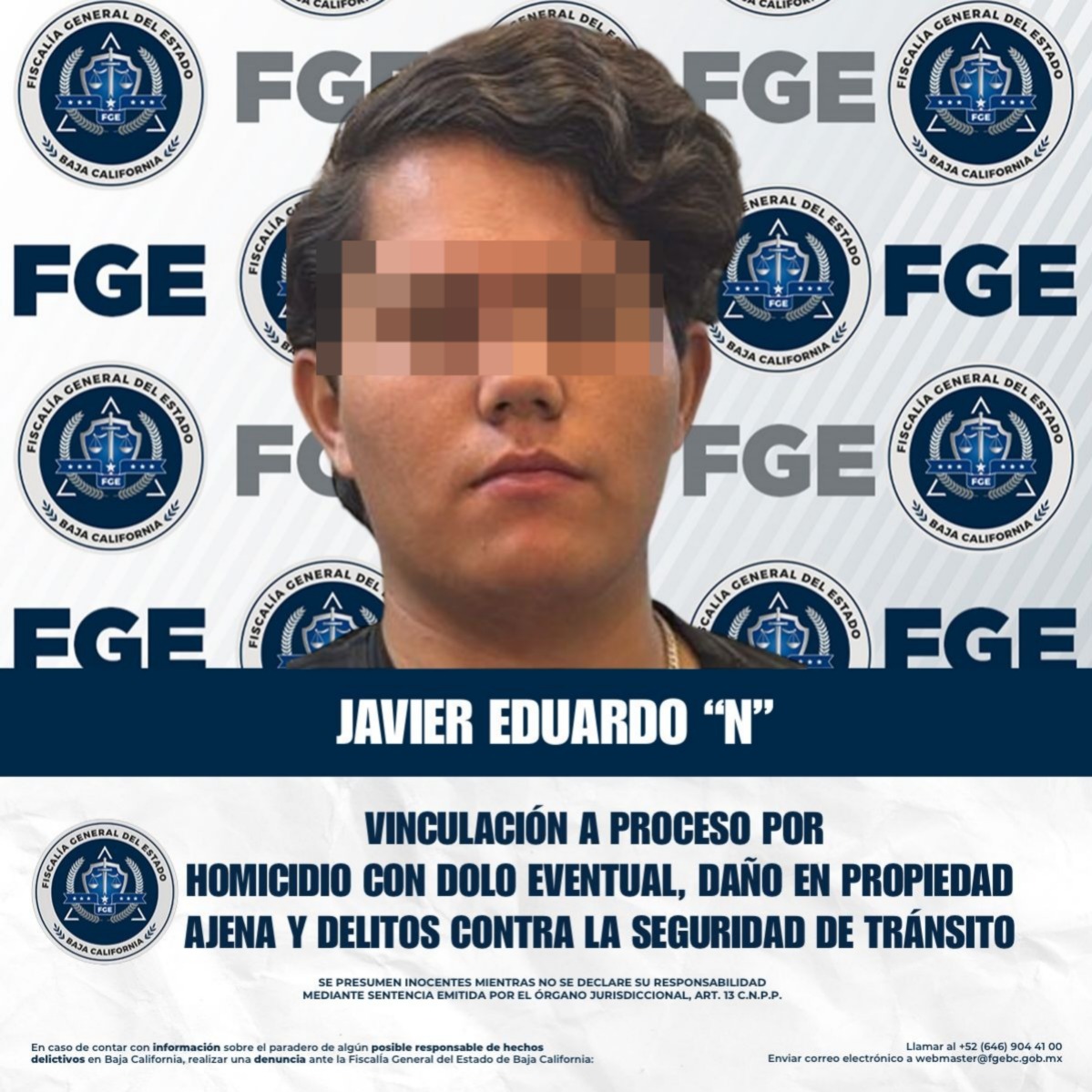TIJUANA, BAJA CALIFORNIA. - La Fiscalía Regional de Tijuana informa que, a través de las labores de la Unidad de Investigación con Detenido, Zona Tijuana, se logró obtener la vinculación a proceso y la imposición de la medida cautelar de prisión preventiva oficiosa en contra de Javier Eduardo “N”, por su probable responsabilidad en los delitos de homicidio cometido con dolo eventual, daño en propiedad ajena y delitos contra la seguridad de hechos de tránsito de vehículos.