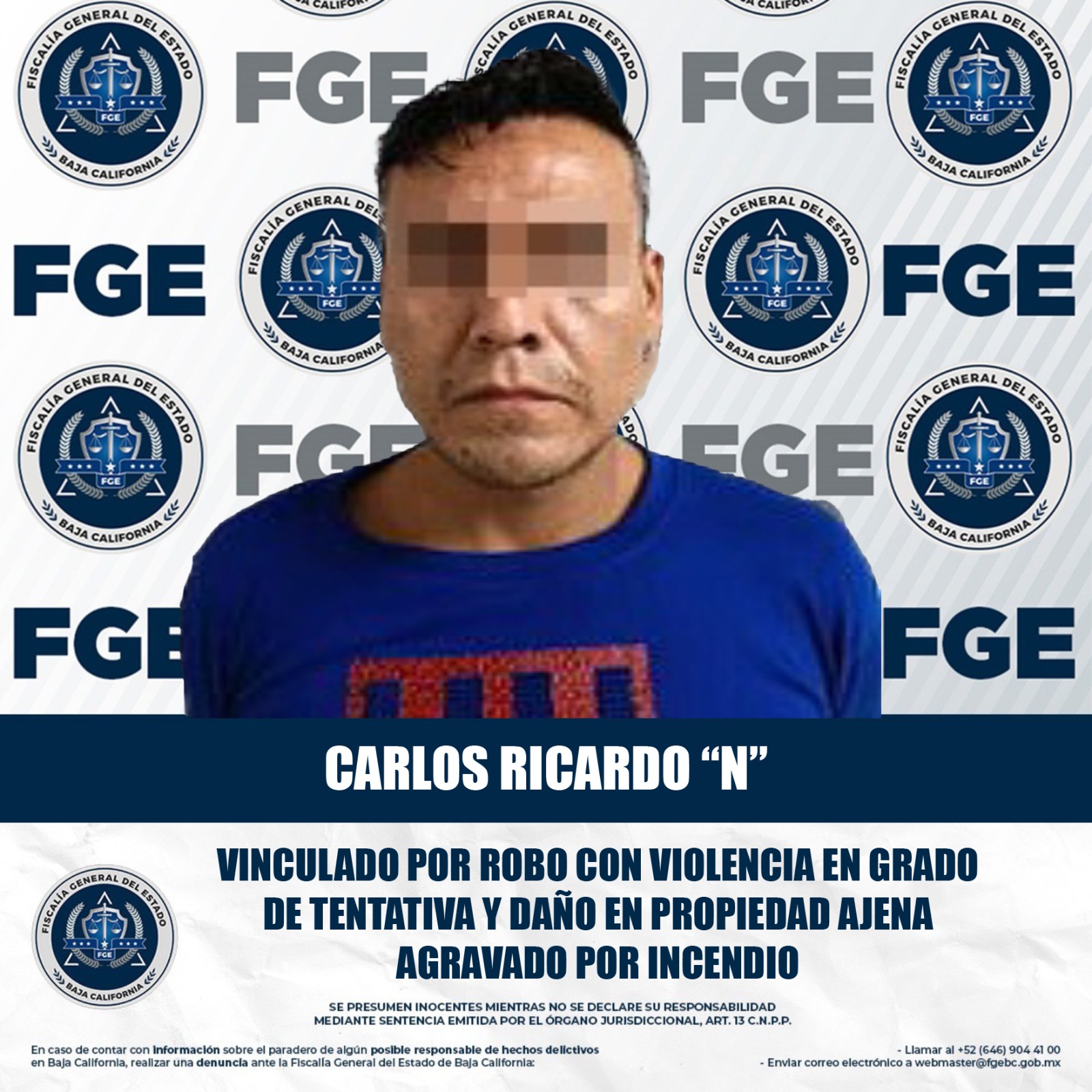MEXICALI, BAJA CALIFORNIA. - La Fiscalía Regional de Mexicali obtuvo la vinculación a proceso en contra de Carlos Ricardo “N”, señalado como presunto responsable de incendiar un centro cambiario ubicado en el fraccionamiento Palmar de Orizaba, durante un intento de robo con violencia.