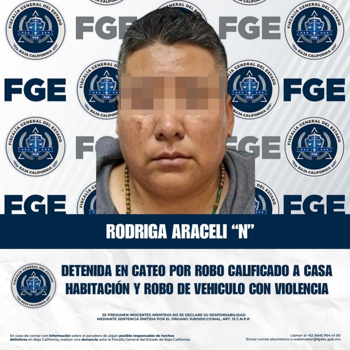 Durante la intervención, donde también se buscaban diversos objetos robados que forman parte de una serie de robos. La operación permitió la detención de una persona, identificada como Rodriga Araceli “N”, de 43 años, quien será procesada por los delitos de robo calificado a casa habitación y robo de vehículo de motor ejecutado con violencia.