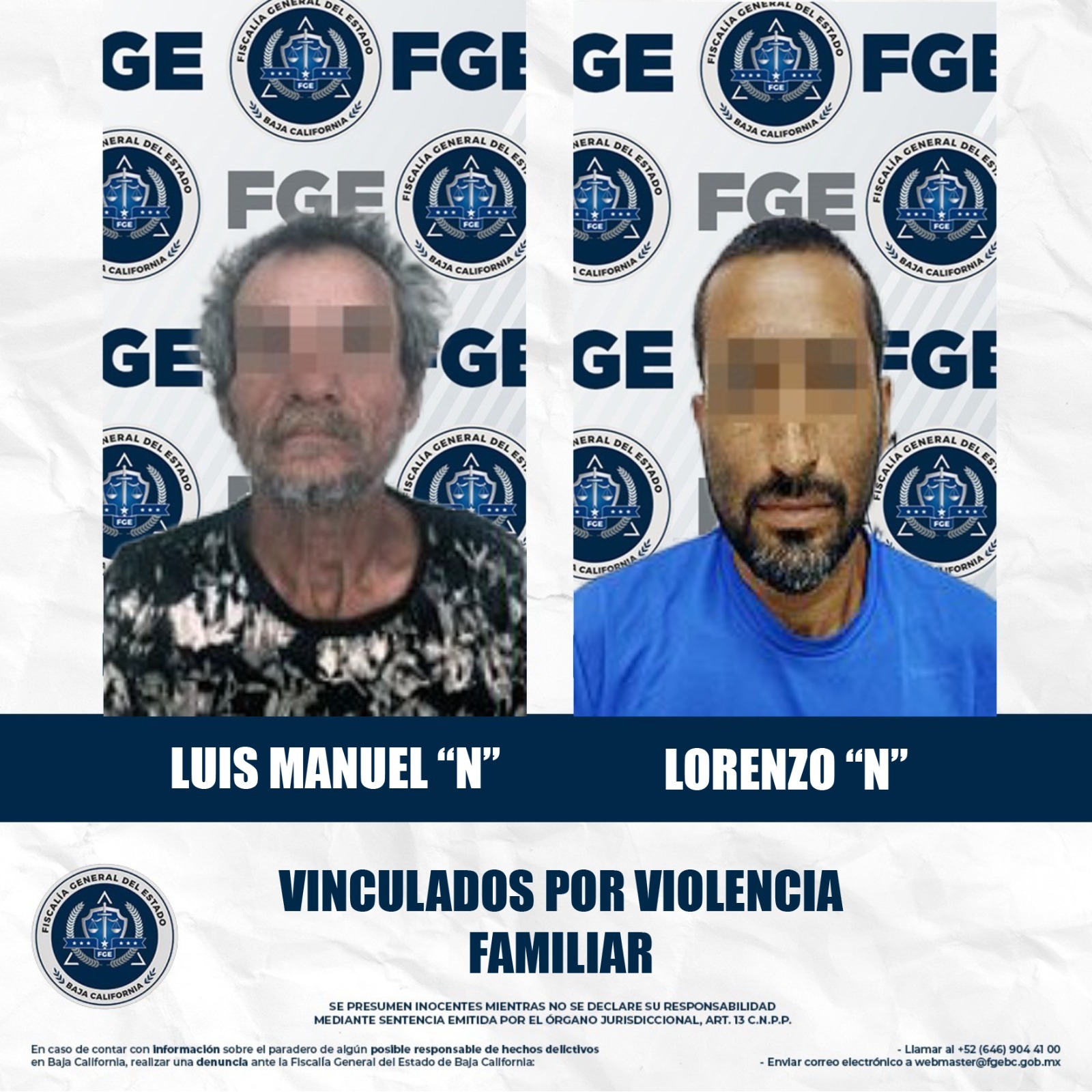 MEXICALI, BAJA CALIFORNIA. - La Fiscalía Regional de Mexicali, a través de la Unidad de Investigación de Delitos con Detenidos Poniente y la Foránea Cd. Guadalupe Victoria, obtuvo la vinculación a proceso de dos hombres imputados por el delito de violencia familiar.