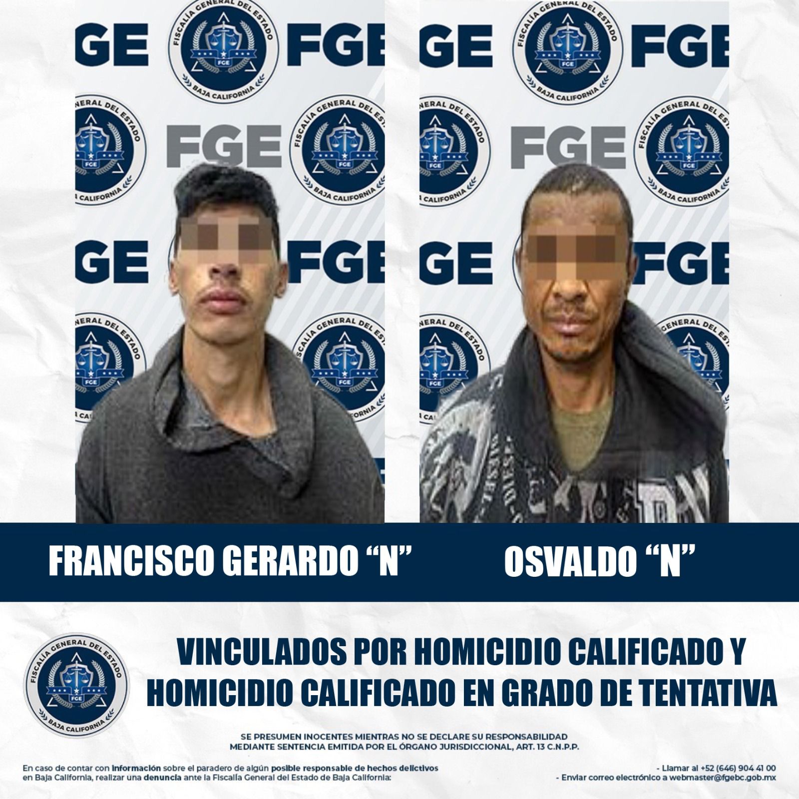 MEXICALI, BAJA CALIFORNIA. - Por su presunta participación en los delitos de homicidio calificado y homicidio calificado en grado de tentativa, la Fiscalía General del Estado obtuvo la vinculación de Francisco Gerardo “N” alias el Mickey” y Osvaldo “N” alias “El Negro”.