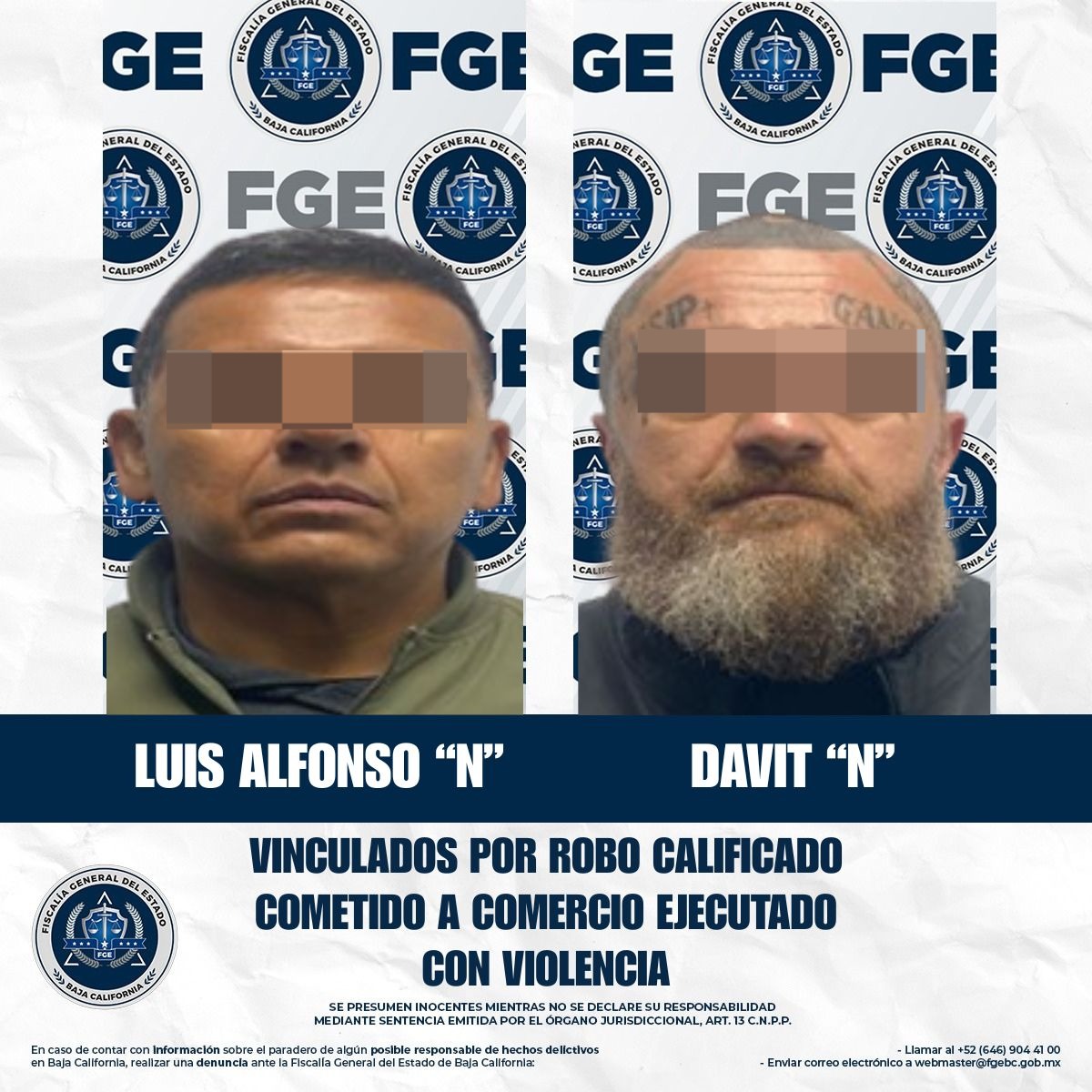 TIJUANA, BAJA CALIFORNIA. - La Unidad de Investigación con Detenido, adscrita a la Fiscalía Regional de Tijuana, obtuvo la vinculación a proceso y la imposición de la prisión preventiva oficiosa en contra de Luis Alfonso “N” y Davit “N”, por el delito de robo calificado cometido a comercio abierto al público, ejecutado con violencia.