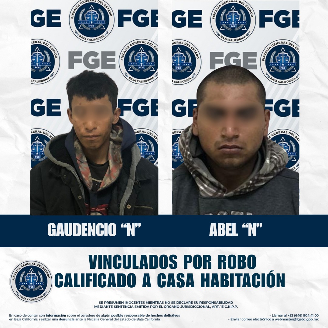 SAN QUINTÍN, BAJA CALIFORNIA. - La Fiscalía Regional de San Quintín obtuvo la vinculación a proceso y la imposición de la medida cautelar de prisión preventiva en contra de Gaudencio “N” y Abel “N”, por su probable responsabilidad en el delito de robo calificado a casa habitación, derivado de hechos ocurridos en la colonia Buena Vista.