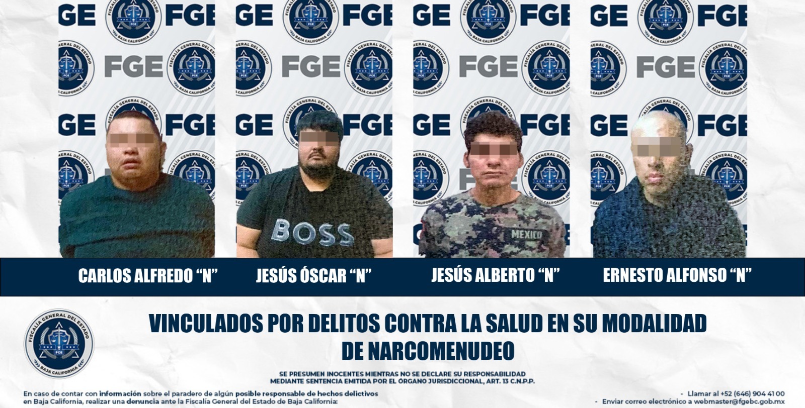 MEXICALI, BAJA CALIFORNIA. - La Fiscalía General del Estado (FGE), a través de la Fiscalía Especializada en Narcomenudeo, obtuvo la vinculación a proceso de cuatro hombres imputados por el delito en contra de la salud en su modalidad de narcomenudeo.