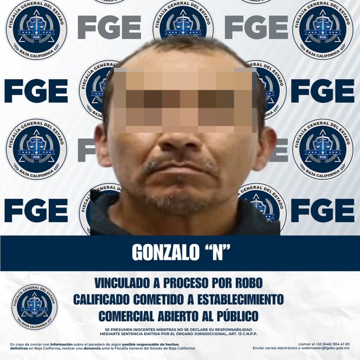 TIJUANA, BAJA CALIFORNIA. - La Fiscalía Regional de Tijuana, a través de la Unidad de Investigación con Detenido Zona Tijuana, obtuvo la vinculación a proceso de Gonzalo “N”, por su presunta responsabilidad en el delito de robo calificado cometido a establecimiento comercial abierto al público.