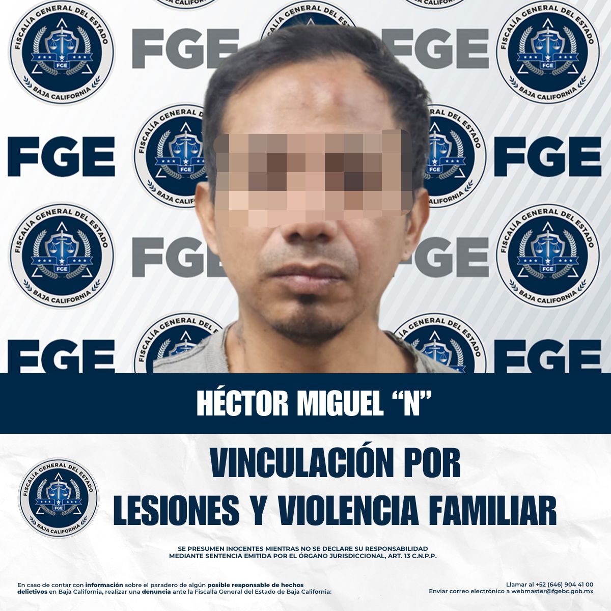 TIJUANA, BAJA CALIFORNIA. - La Fiscalía Regional de Tijuana, a través de las labores realizadas por la Unidad de Investigación con Detenido, logró la vinculación a proceso de Héctor Miguel “N” por su presunta responsabilidad en los delitos de lesiones y violencia familiar, derivado de hechos registrados en el fraccionamiento Hacienda Las Delicias III, en esta ciudad.