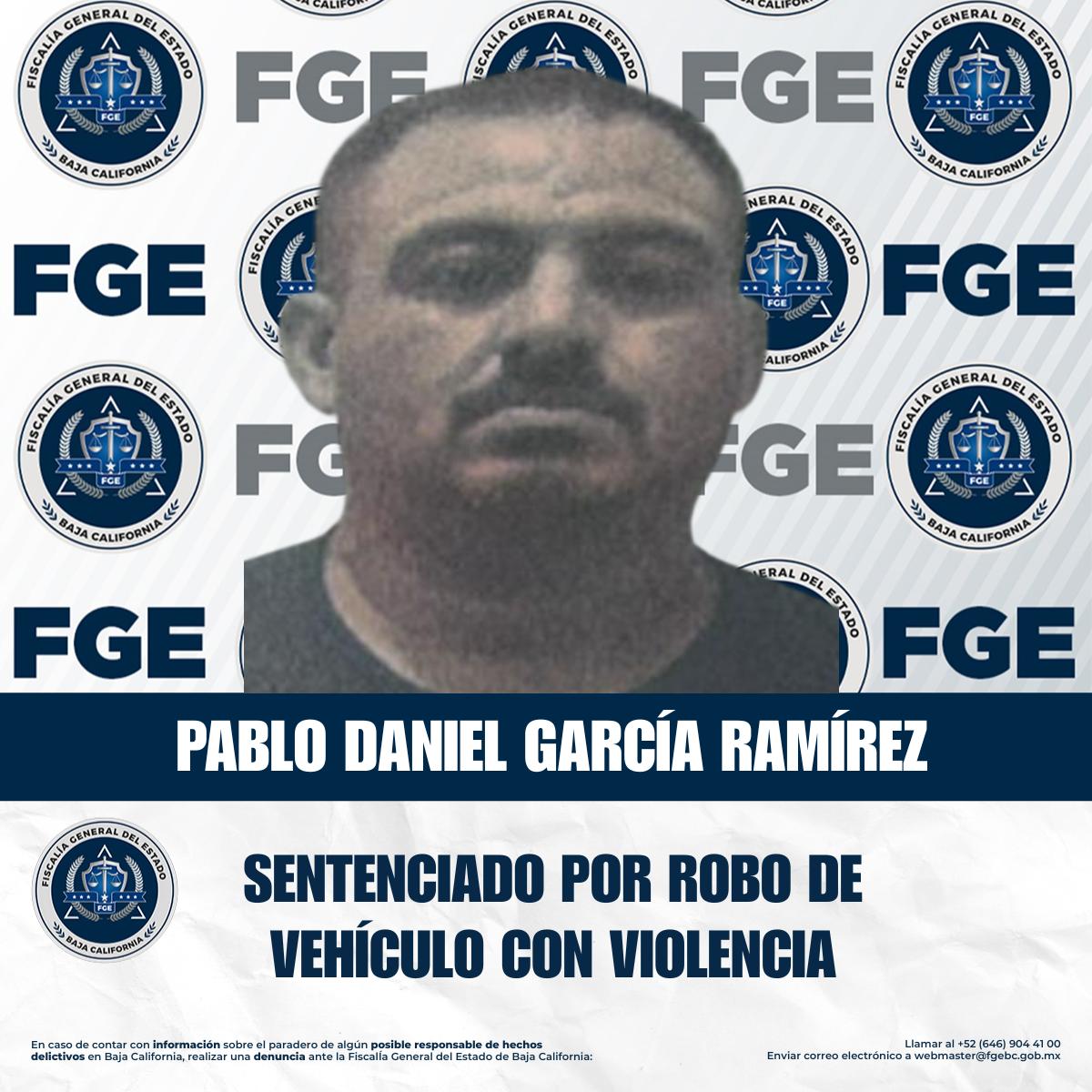 TIJUANA, BAJA CALIFORNIA. - La Fiscalía Regional de Tijuana, a través de los trabajos realizados por la Unidad de Investigación de Robo de Vehículos, Zona Tijuana, obtuvo sentencia condenatoria en contra de Pablo Daniel García Ramírez, por su responsabilidad en los delitos de robo equiparado de vehículo de motor en su modalidad de usar y robo de vehículo con violencia, derivados de hechos ocurridos en esta ciudad.