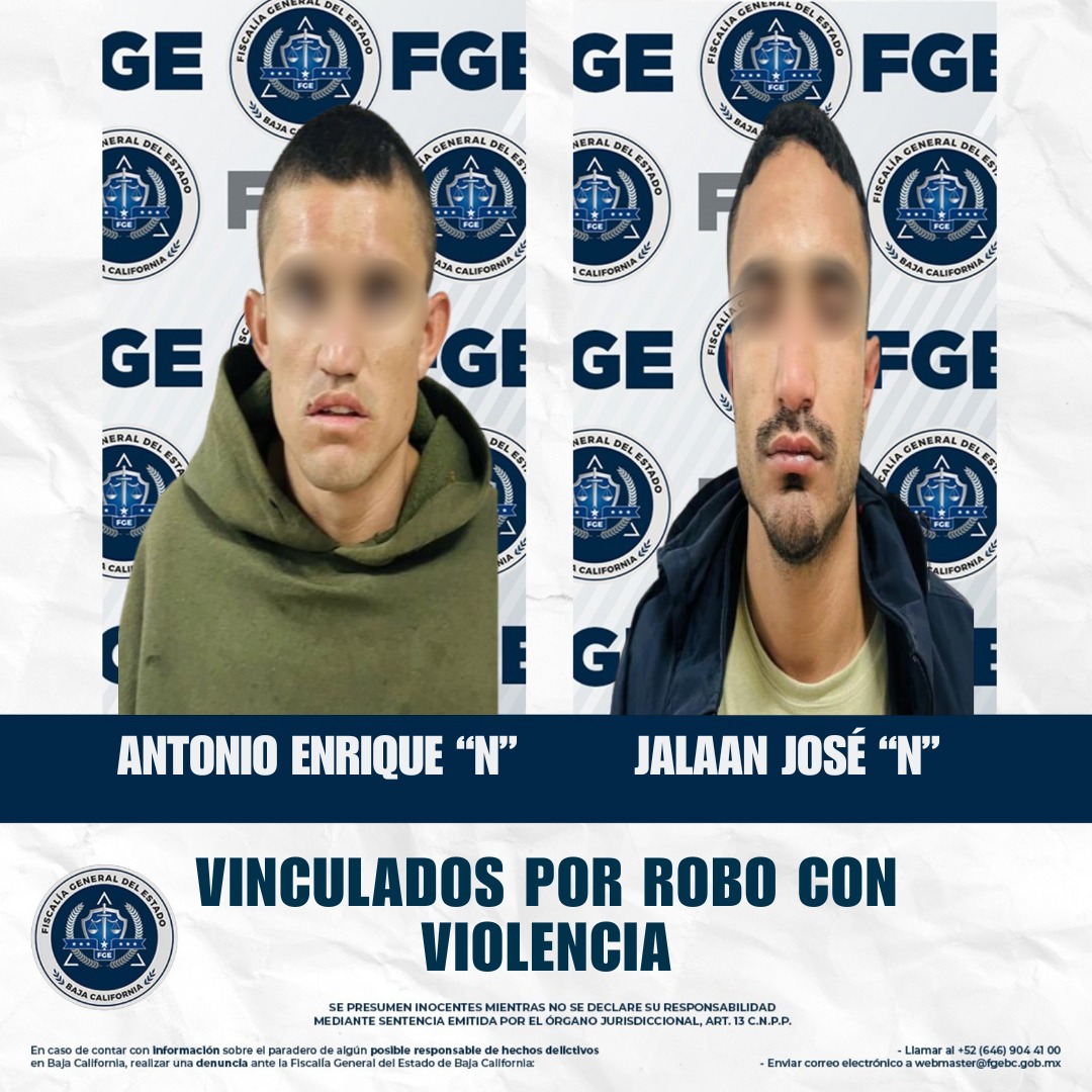 ENSENADA, BAJA CALIFORNIA. - La Fiscalía Regional de Ensenada informó que obtuvo la vinculación a proceso de Antonio Enrique “N” y Jalaan José “N”, por su presunta participación en un robo calificado cometido por dos o más personas con violencia.