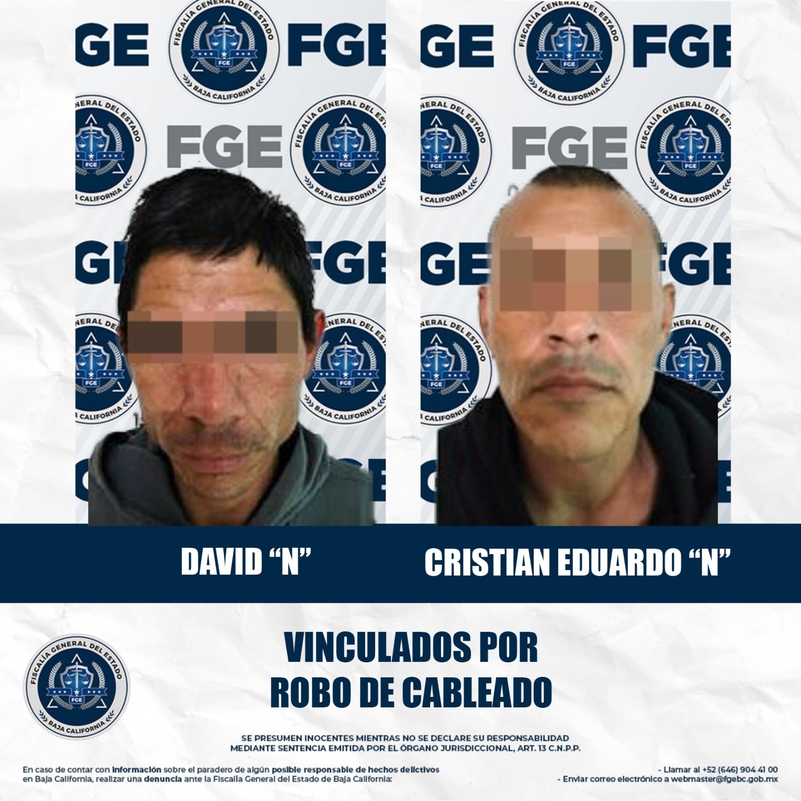 MEXICALI, BAJA CALIFORNIA. - La Fiscalía Regional de Mexicali, a través de la Unidad de Investigación con Detenidos Oriente, obtuvo la vinculación a proceso de David “N” y Cristian Eduardo “N”, por su presunta participación en el delito de robo de cableado.