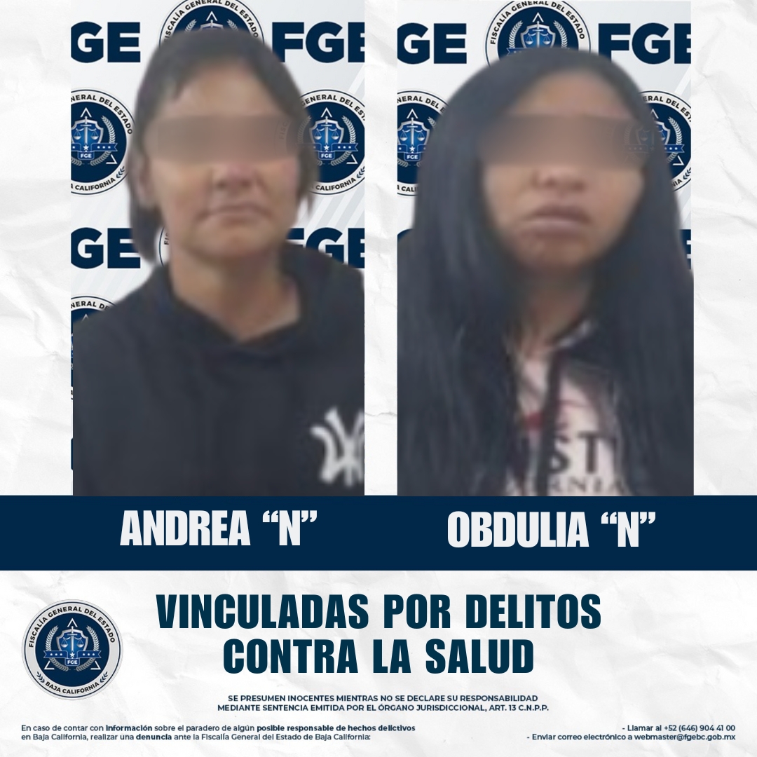 ENSENADA, BAJA CALIFORNIA. - La Fiscalía Especializada en Narcomenudeo llevó a cabo la vinculación a proceso de Andrea “N” y Obdulia “N” por delitos contra la salud, como resultado de acciones de investigación y combate al narcomenudeo en la ciudad de Ensenada.