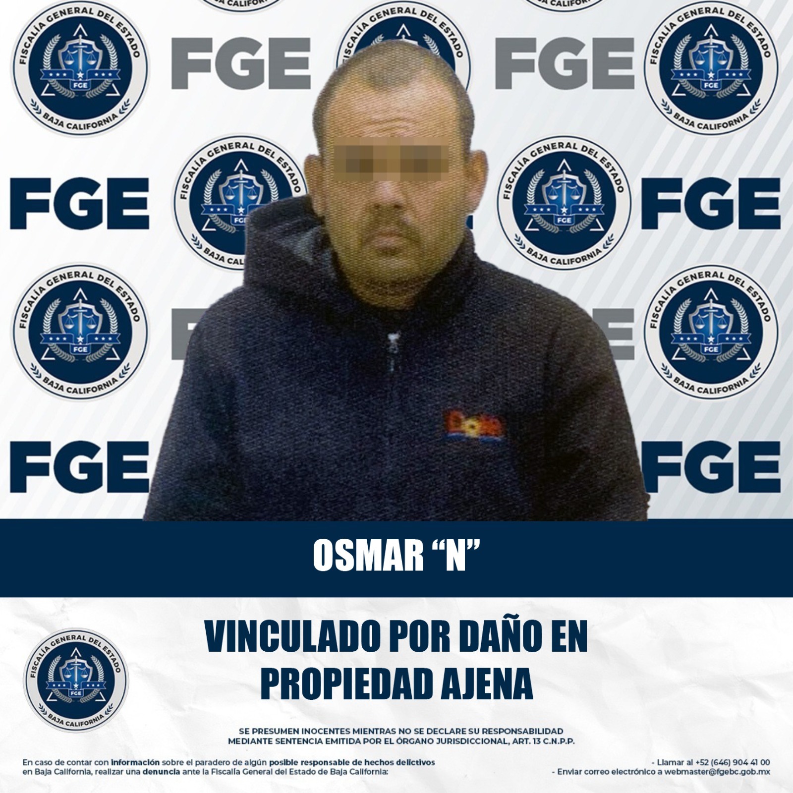 MEXICALI, BAJA CALIFORNIA. - La Fiscalía Regional de Mexicali, a través de la Unidad de Investigación Foránea Guadalupe Victoria, obtuvo la vinculación a proceso de un hombre imputado por el delito de daño en propiedad ajena.