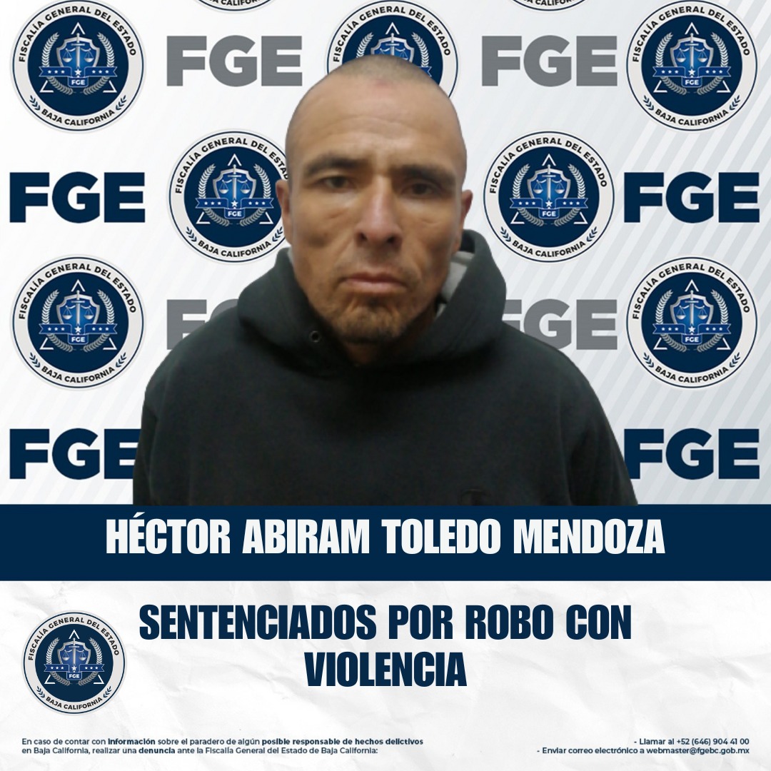 ENSENADA, BAJA CALIFORNIA. - La Fiscalía Regional de Ensenada logró una sentencia condenatoria en contra de Héctor Abiram Toledo Mendoza, quien fue encontrado culpable del delito de robo con violencia, tras el desarrollo del proceso penal correspondiente.