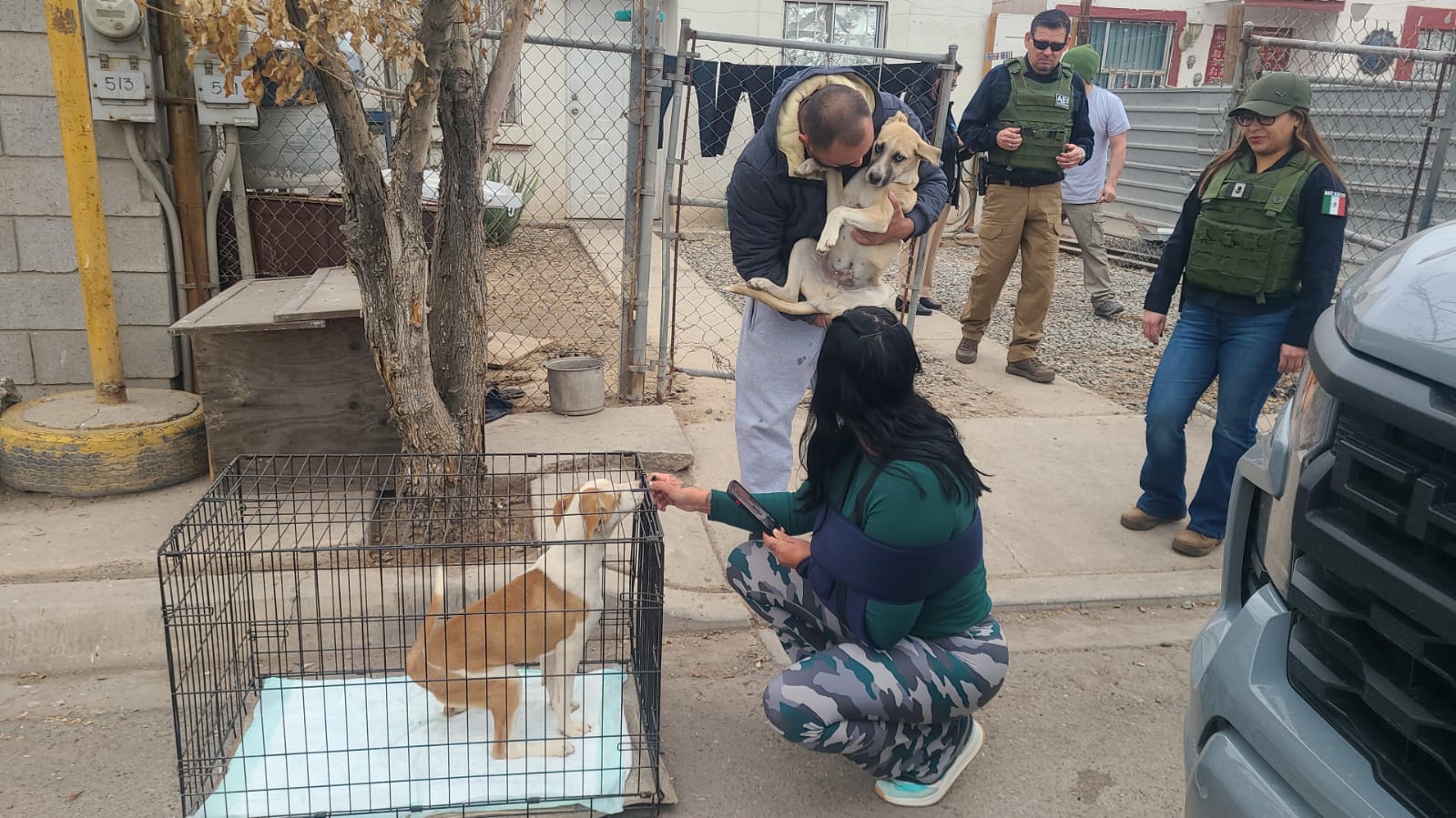 MEXICALI, BAJA CALIFORNIA. - La Fiscalía Regional de Mexicali, en coordinación con la Fiscalía Especializada en Delitos Ambientales y Contra los Animales, rescató durante un cateo a tres mascotas que se encontraban encadenadas.