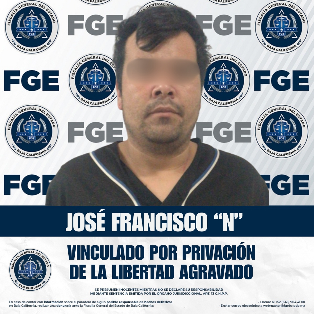 ENSENADA, BAJA CALIFORNIA. - La Fiscalía Regional de Ensenada, en coordinación con la Unidad de Investigación con Detenido, logró la vinculación a proceso de José Francisco “N” por el delito de privación ilegal de la libertad agravada.