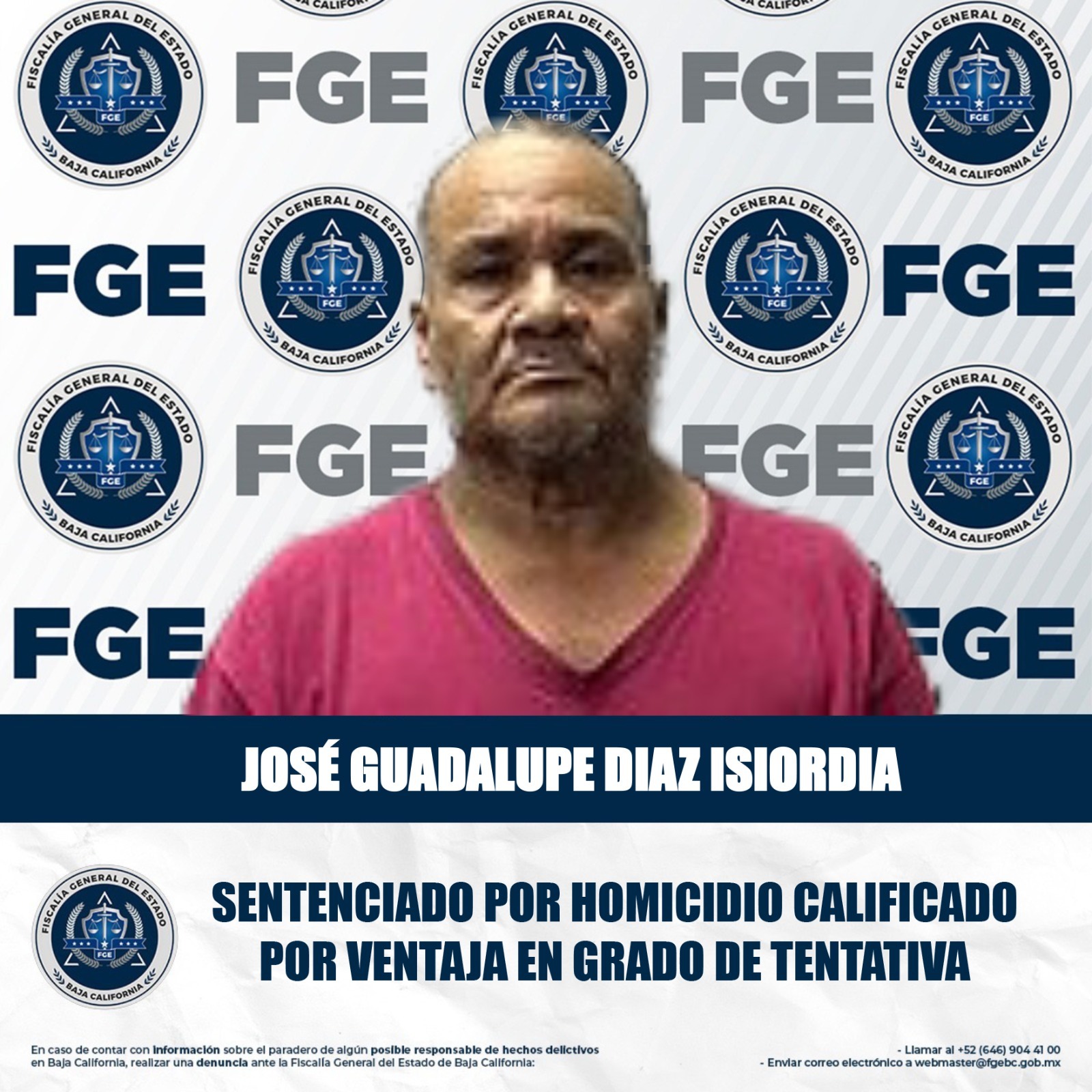 MEXICALI, BAJA CALIFORNIA. - La Fiscalía General del Estado de Baja California, a través de la Fiscalía Especializada en Delitos Contra la Vida, logro sentencia condenatoria en contra de José Guadalupe Díaz Isiordia por el delito de homicidio calificado por ventaja en grado de tentativa.