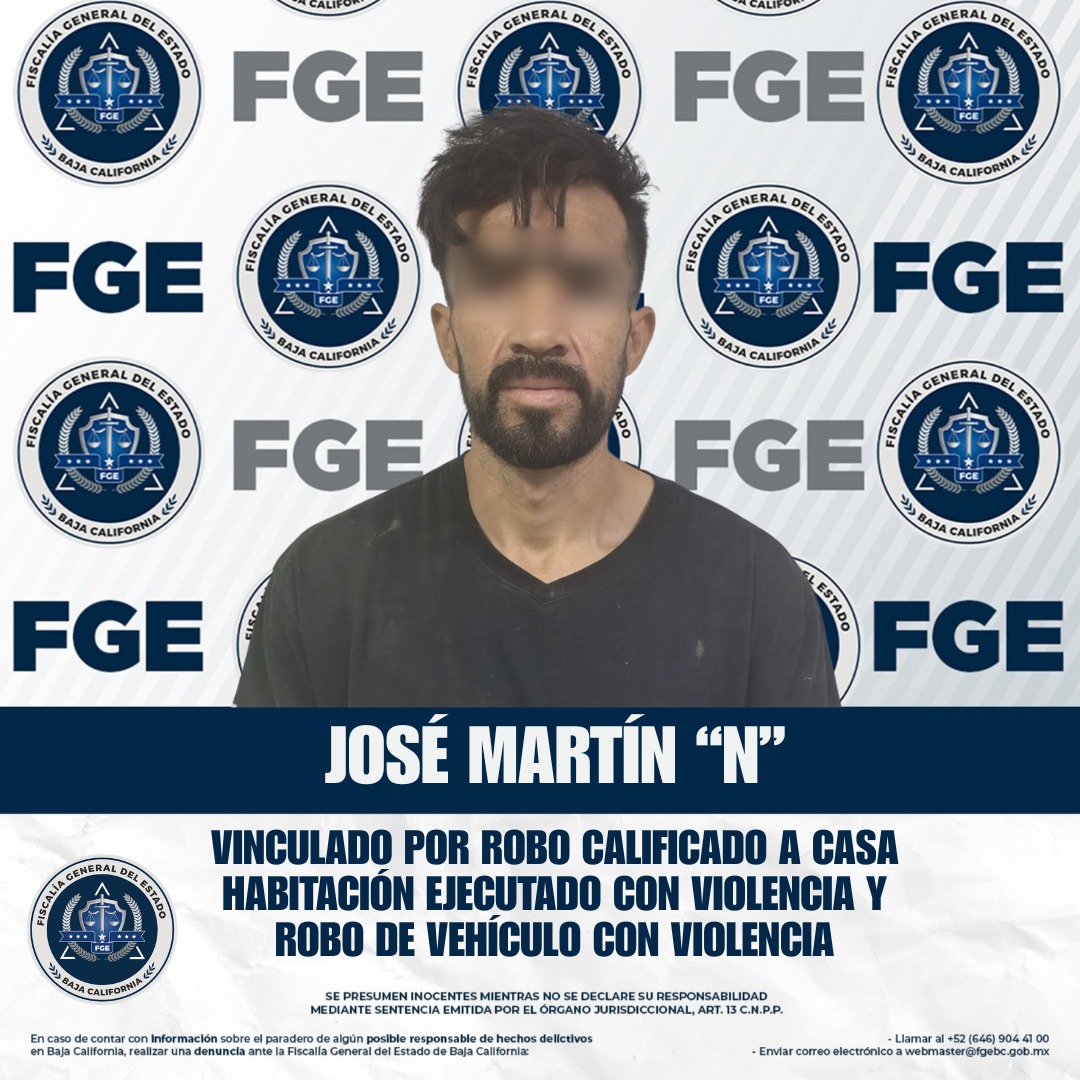 ENSENADA, BAJA CALIFORNIA. - La Fiscalía General del Estado de Baja California, a cargo de la Fiscal General, Dra. Ma. Elena Andrade Ramírez, obtuvo del juez de control la vinculación a proceso y la medida cautelar de prisión preventiva contra Everardo “N”, alias “El Ever”, por homicidio calificado con premeditación y ventaja, así como contra él y José Martín “N” por su probable participación en los delitos de robo calificado a casa habitación y robo de vehículos.