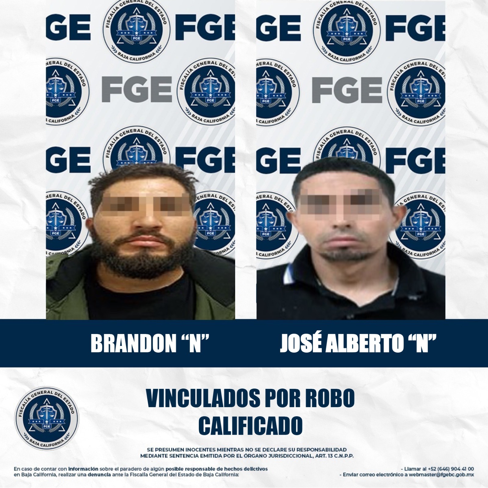 MEXICALI, BAJA CALIFORNIA. - La Fiscalía Regional de Mexicali, a través de la Unidad de Investigación de Delitos de Robos Poniente y Robos Oriente, obtuvo la vinculación a proceso de dos hombres imputados por el delito de robo calificado cometido a establecimiento comercial abierto al público con violencia.