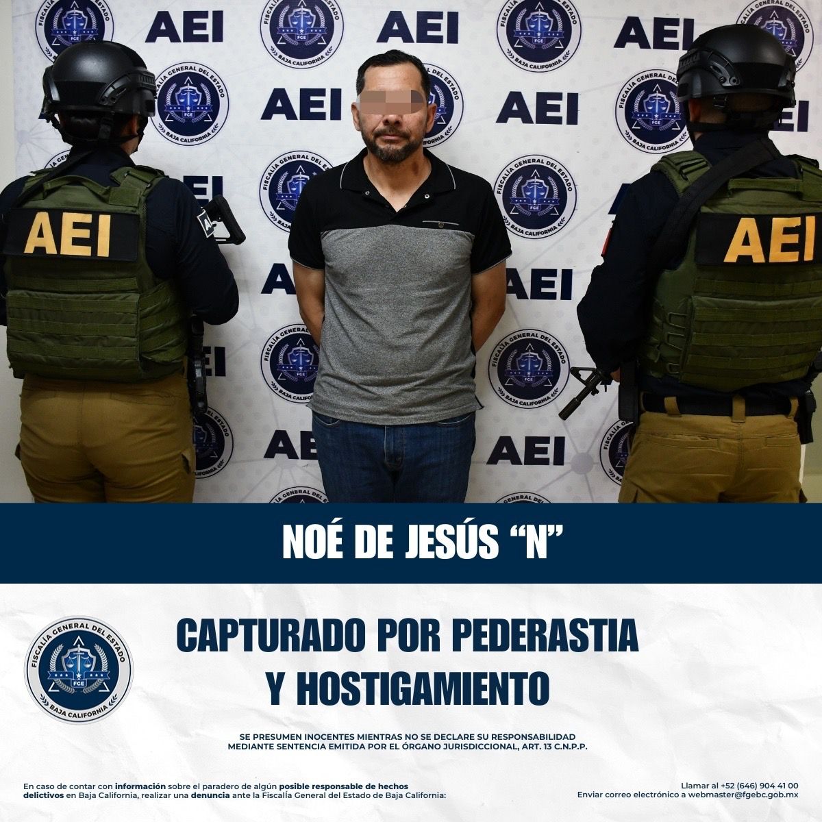 TIJUANA, BAJA CALIFORNIA. - La Fiscalía General del Estado informa que, a través de la Agencia Estatal de Investigación, Zona Tijuana, adscrita a la Unidad de Investigación Especializada en Delitos Sexuales, el día 07 de enero de 2026, a las 11:50 horas, se cumplimentó una orden de aprehensión en el bulevar Díaz Ordaz, colonia Jardines de la Mesa, en la ciudad de Tijuana, Baja California. La diligencia fue realizada en contra de Noé de Jesús “N”, por su probable responsabilidad en los delitos de pederastia y hostigamiento.