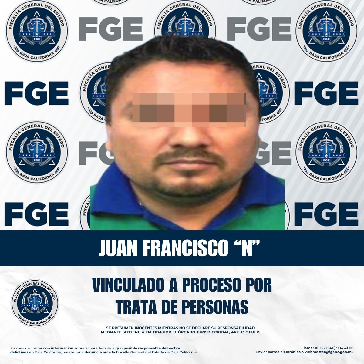 TIJUANA, BAJA CALIFORNIA. - La Fiscalía General del Estado obtuvo la vinculación a proceso de Juan Francisco “N” por el delito de trata de personas, en su modalidad de explotación sexual agravada, derivado de diversas investigaciones realizadas por la Unidad de Investigación Especializada en Combate a la Trata de Personas, adscrita a la Fiscalía Especializada en Delitos Contra Mujeres por Razón de Género.
