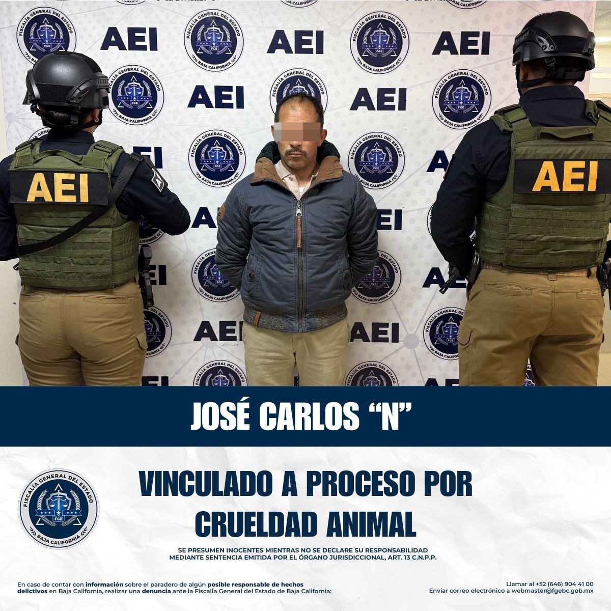 TIJUANA, BAJA CALIFORNIA. - La Fiscalía General del Estado de Baja California, a través de la Unidad de Investigación con Detenido de la Fiscalía Regional de Tijuana, y en coordinación con la Fiscalía Especializada en Delitos Ambientales y Contra los Animales, obtuvo la vinculación a proceso y la medida cautelar de prisión preventiva justificada en contra de José Carlos “N”, alias “El Cali”, por su probable responsabilidad en el delito de crueldad animal.