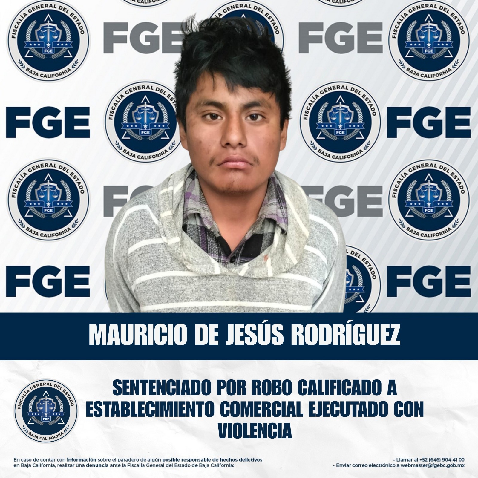 SAN QUINTÍN, BAJA CALIFORNIA. - La Fiscalía Regional de San Quintín, en coordinación con la Unidad de Investigación San Quintín, obtuvo una sentencia condenatoria en contra de Mauricio de Jesús Rodríguez por el delito de robo calificado a establecimiento comercial abierto al público, cometido con violencia, como resultado del trabajo de investigación y seguimiento del caso.