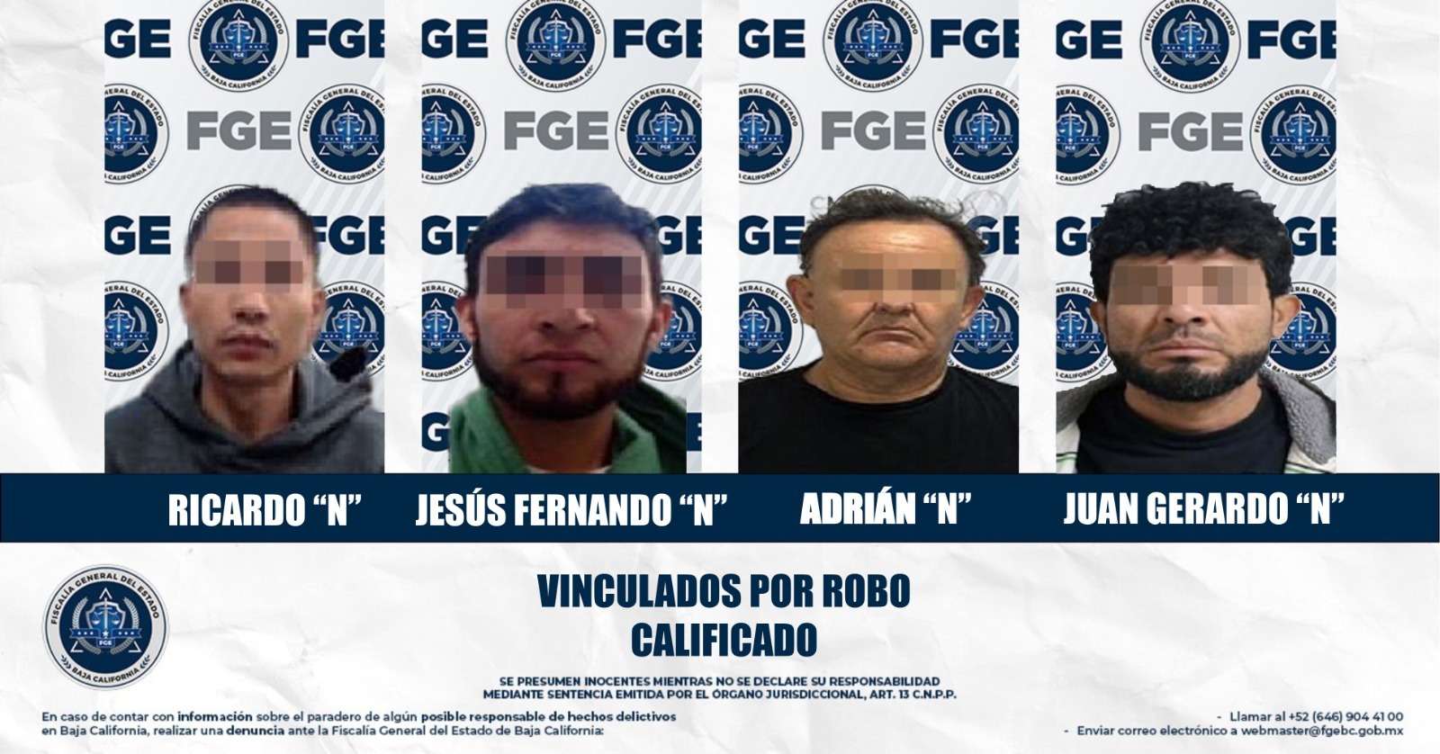 MEXICALI, BAJA CALIFORNIA. - La Fiscalía Regional de Mexicali, a través de la Unidad de Investigación de Delitos con Detenidos Poniente, obtuvo la vinculación a proceso de cuatro hombres imputados por los delitos de robo con violencia calificado por dos personas, robo calificado a lugar cerrado y robo calificado cometido con violencia.
