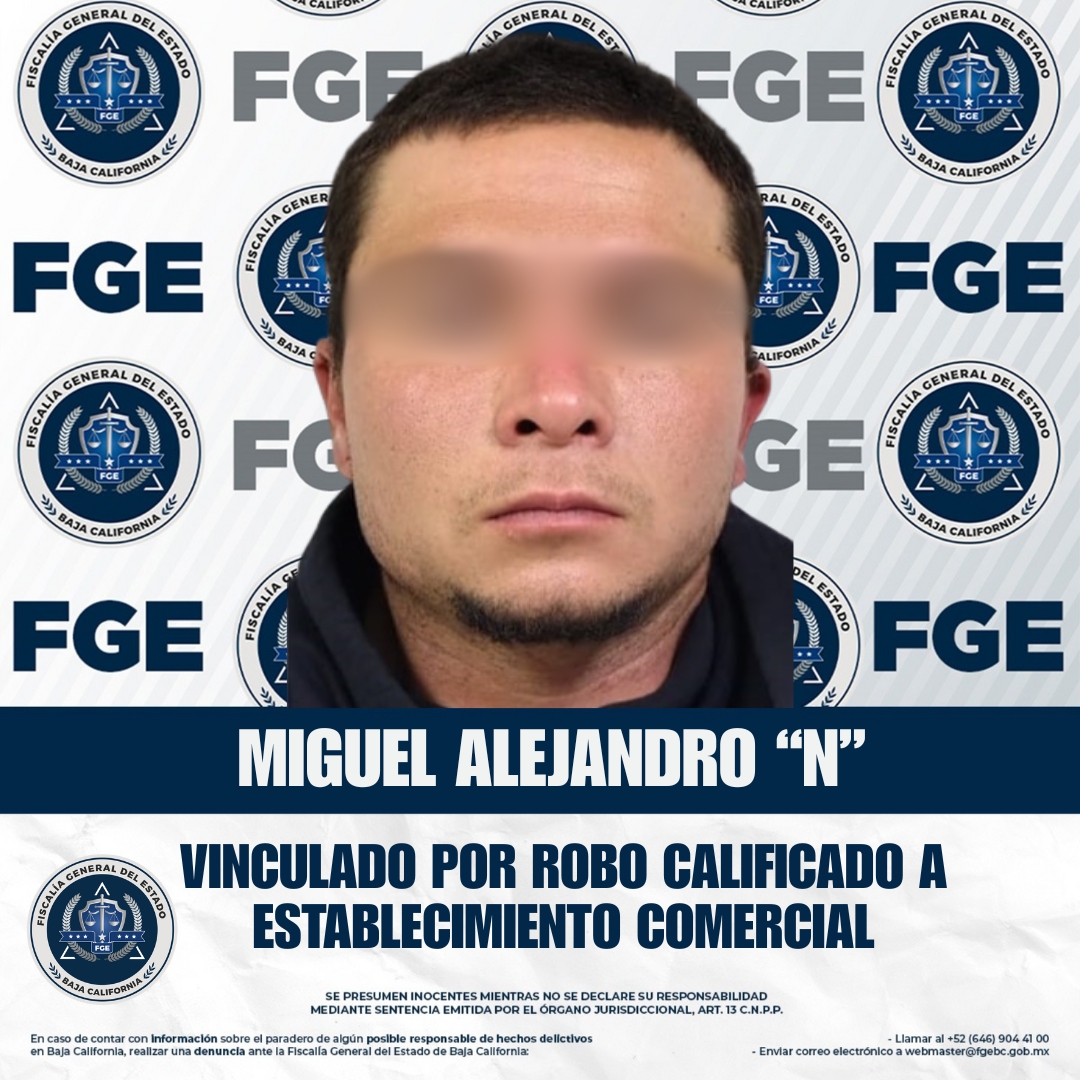 ENSENADA, BAJA CALIFORNIA. - La Fiscalía Regional de Ensenada logró la vinculación a proceso de Miguel Alejandro “N”, imputado por robo calificado a establecimiento comercial con violencia. Además, el juez dictó prisión preventiva oficiosa mientras se realiza la investigación complementaria.