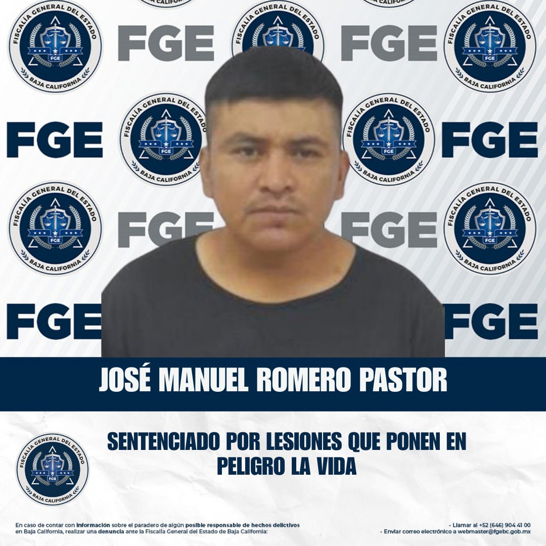 SAN QUINTÍN, BAJA CALIFORNIA. - La Fiscalía Regional de San Quintín obtuvo una sentencia condenatoria en contra de José Manuel Romero Pastor, responsable del delito de lesiones que ponen en peligro la vida, a quien se le impuso una pena de 3 años y 8 meses de prisión, como resultado del trabajo de investigación realizado por el Ministerio Público y la actuación oportuna de las autoridades policiales.