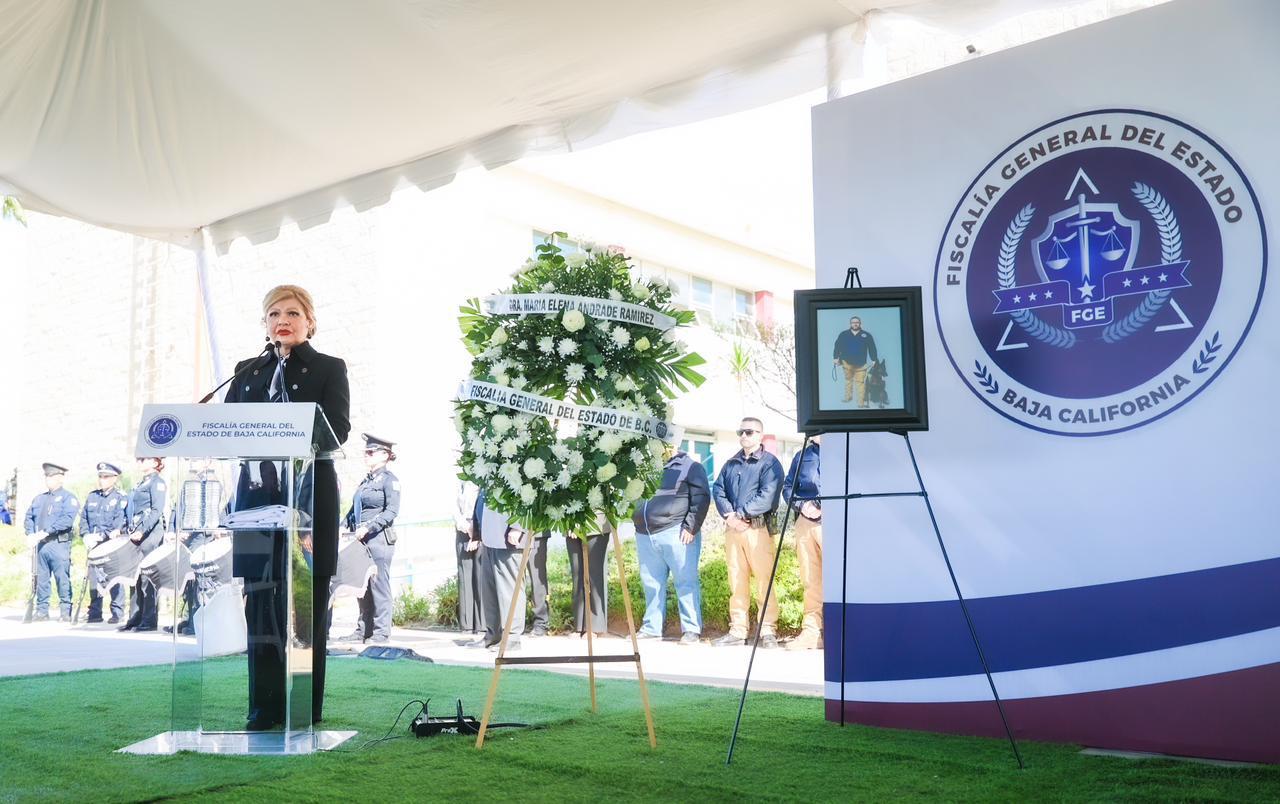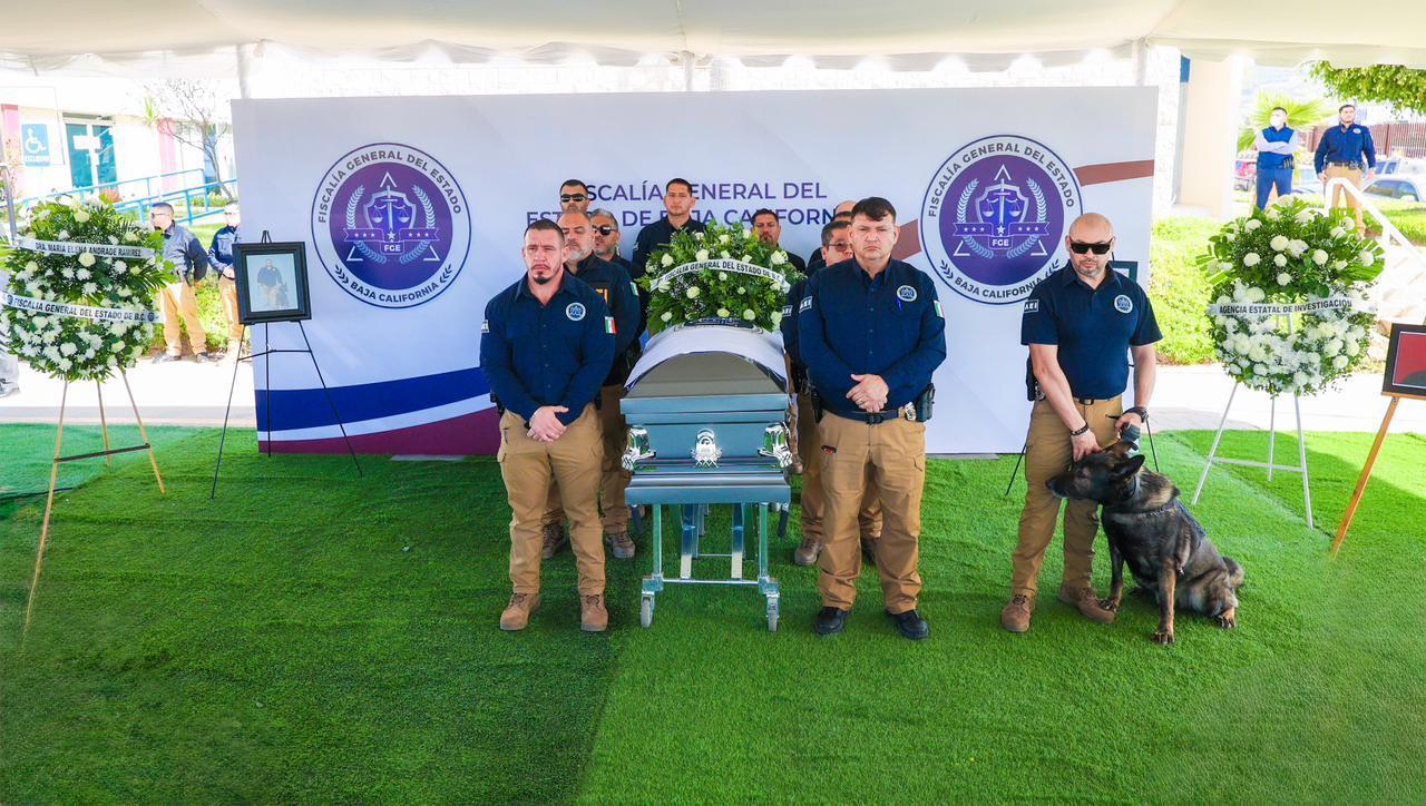 ENSENADA, BAJA CALIFORNIA. - La Fiscalía General del Estado (FGE), encabezada por la Fiscal General, Dra. Ma. Elena Andrade Ramírez, llevó a cabo la ceremonia de honras fúnebres en memoria del subcomandante operativo de la Agencia Estatal de Investigación (AEI) en Ensenada, Israel Ortiz Castillo, como un acto solemne de reconocimiento a su entrega, valor y compromiso con la procuración de justicia en Baja California.