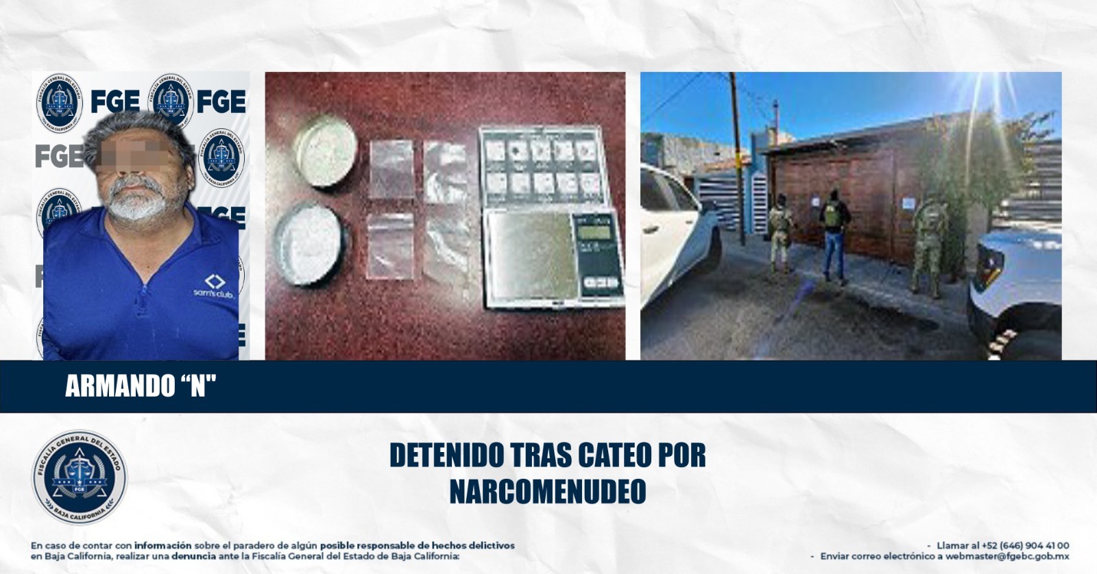 MEXICALI, BAJA CALIFORNIA. - La Fiscalía General del Estado (FGE), a través de la Fiscalía Especializada en Narcomenudeo, llevo a cabo la ejecución de un cateo especializado en un inmueble ubicado en el fraccionamiento Villanova.