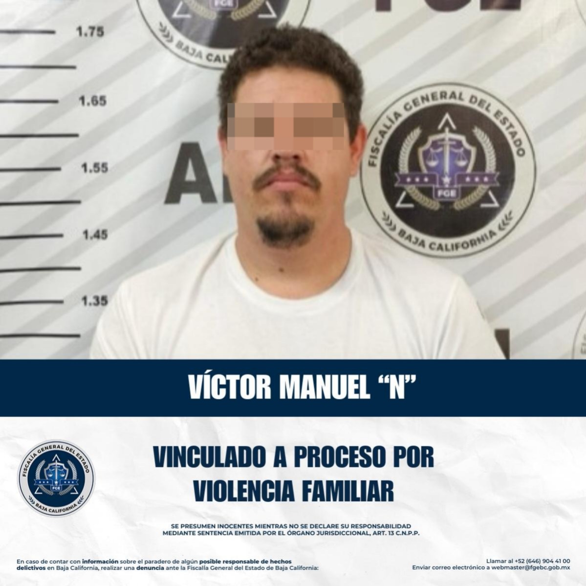 TECATE, BAJA CALIFORNIA. - La Fiscalía General del Estado, a través de la Fiscalía Especializada en Delitos contra la Mujer por Razón de Género y la Unidad de Investigación de Delitos contra la Libertad Sexual y la Familia de Tecate, logró obtener la vinculación a proceso con prisión preventiva justificada contra Víctor Manuel “N”, por su probable responsabilidad en los delitos de violencia familiar física y psicológica en agravio de su esposa.