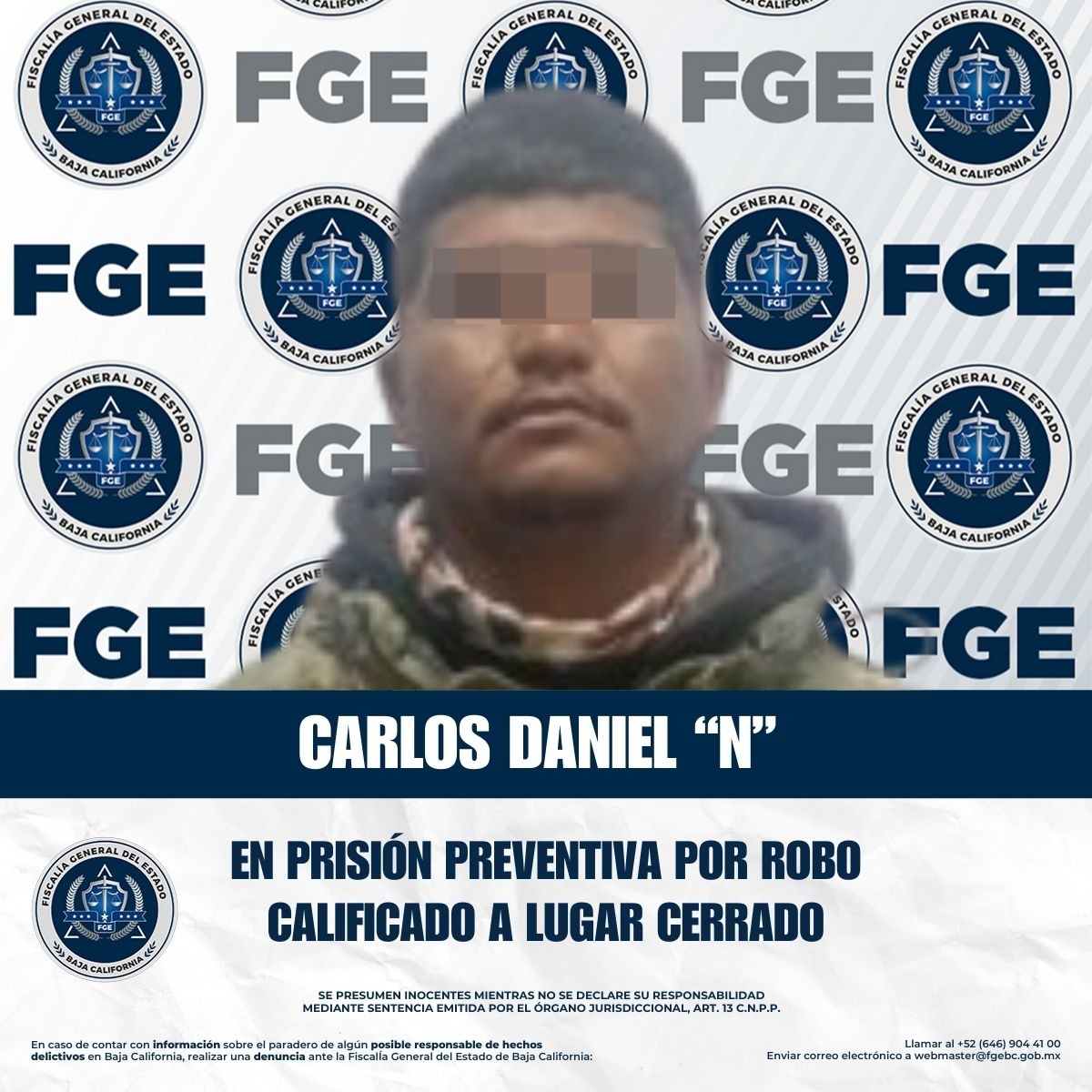 TIJUANA, BAJA CALIFORNIA. - La Unidad de Investigación con Detenido, adscrita a la Fiscalía Regional de Tijuana, obtuvo la vinculación a proceso, así como la imposición de la medida cautelar de prisión preventiva, en contra de Carlos Daniel “N”, por su presunta responsabilidad en el delito de robo calificado a lugar cerrado.
