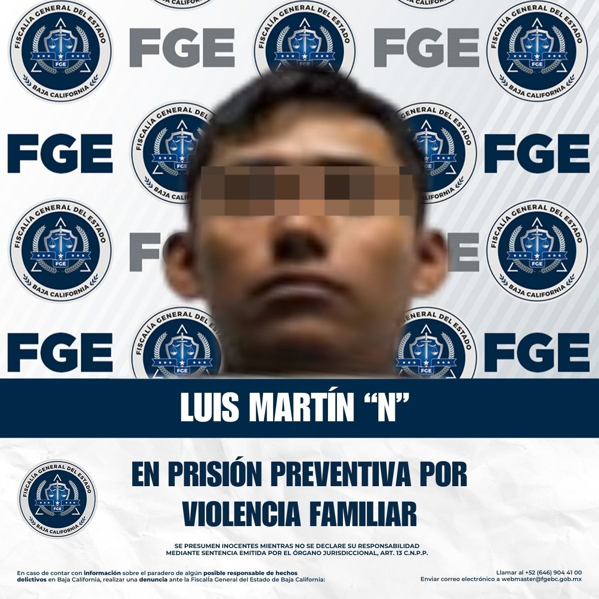TIJUANA, BAJA CALIFORNIA. - La Unidad de Investigación con Detenido, adscrita a la Fiscalía Regional de Tijuana, obtuvo la vinculación a proceso y la imposición de la medida cautelar de prisión preventiva en contra de Luis Martín “N”, por su presunta responsabilidad en el delito de violencia familiar.