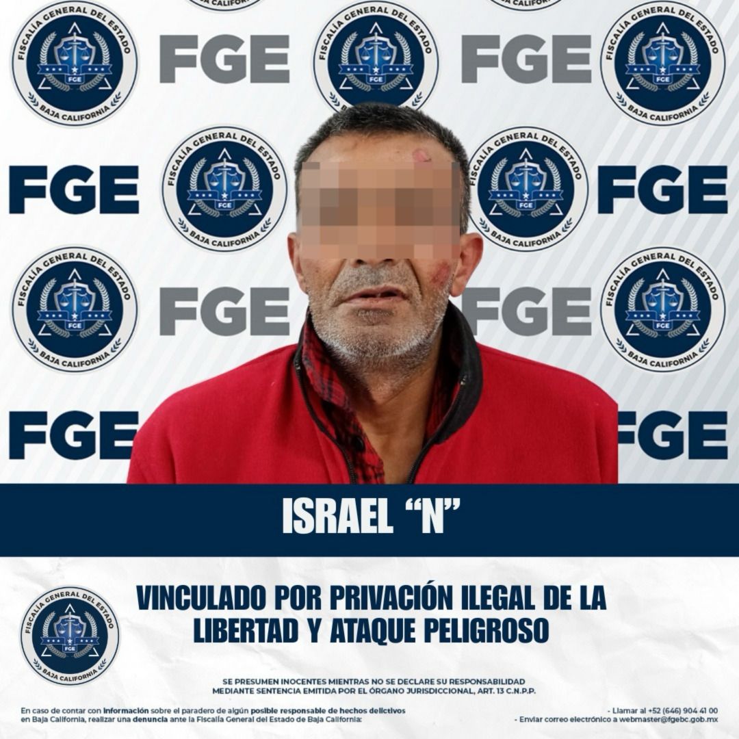 ENSENADA, BAJA CALIFORNIA. - La Fiscalía Regional de Ensenada logró la vinculación a proceso y la imposición de prisión preventiva oficiosa en contra de Israel “N”, de 53 años de edad, por su presunta responsabilidad en los delitos de privación ilegal de la libertad agravada y ataque peligroso, derivados de hechos ocurridos en la delegación El Sauzal.