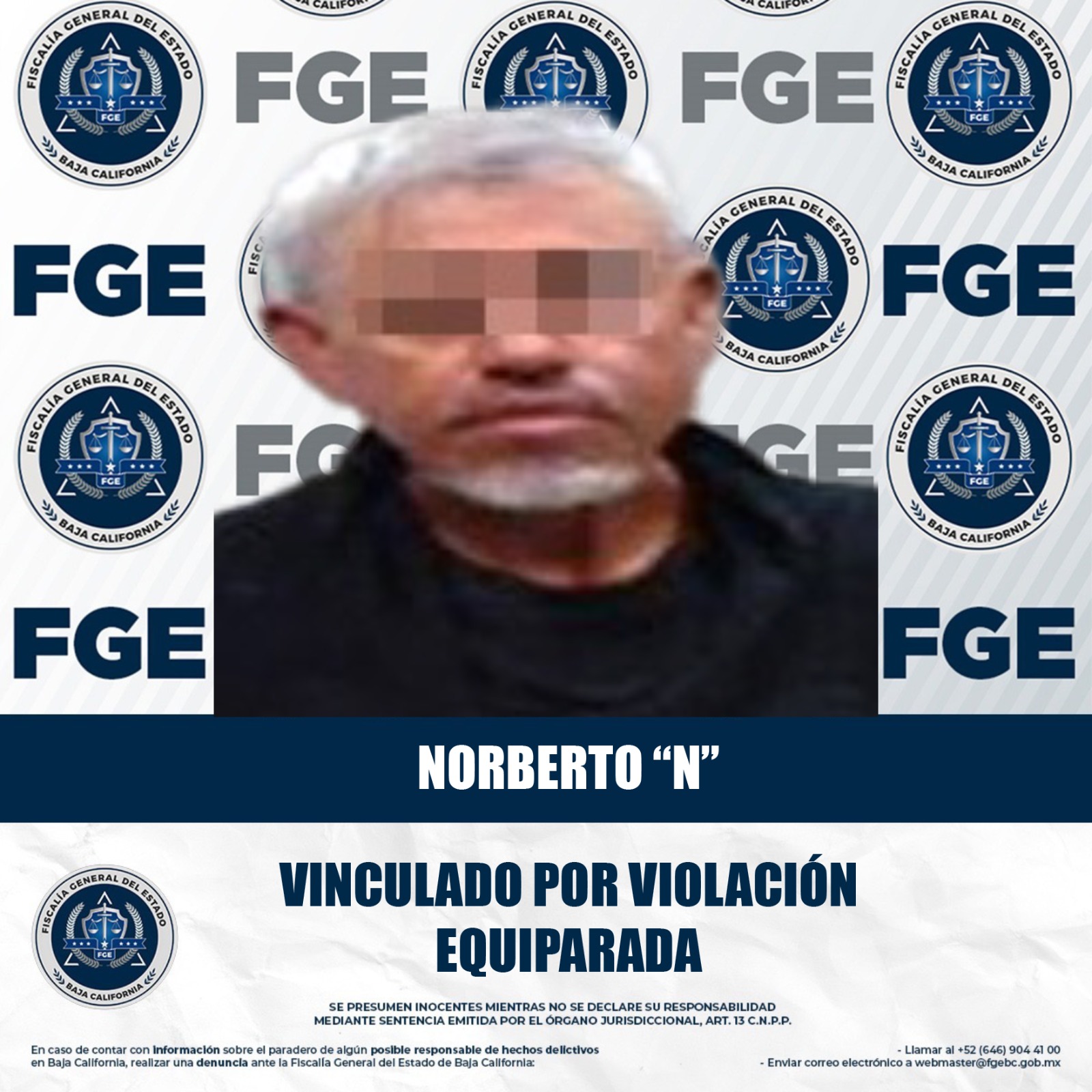 MEXICALI, BAJA CALIFORNIA. - La Fiscalía Regional de Mexicali, a través de la Unidad de Investigación con Detenidos Poniente, obtuvo la vinculación a proceso de un hombre por su presunta responsabilidad en el delito de violación equiparada.