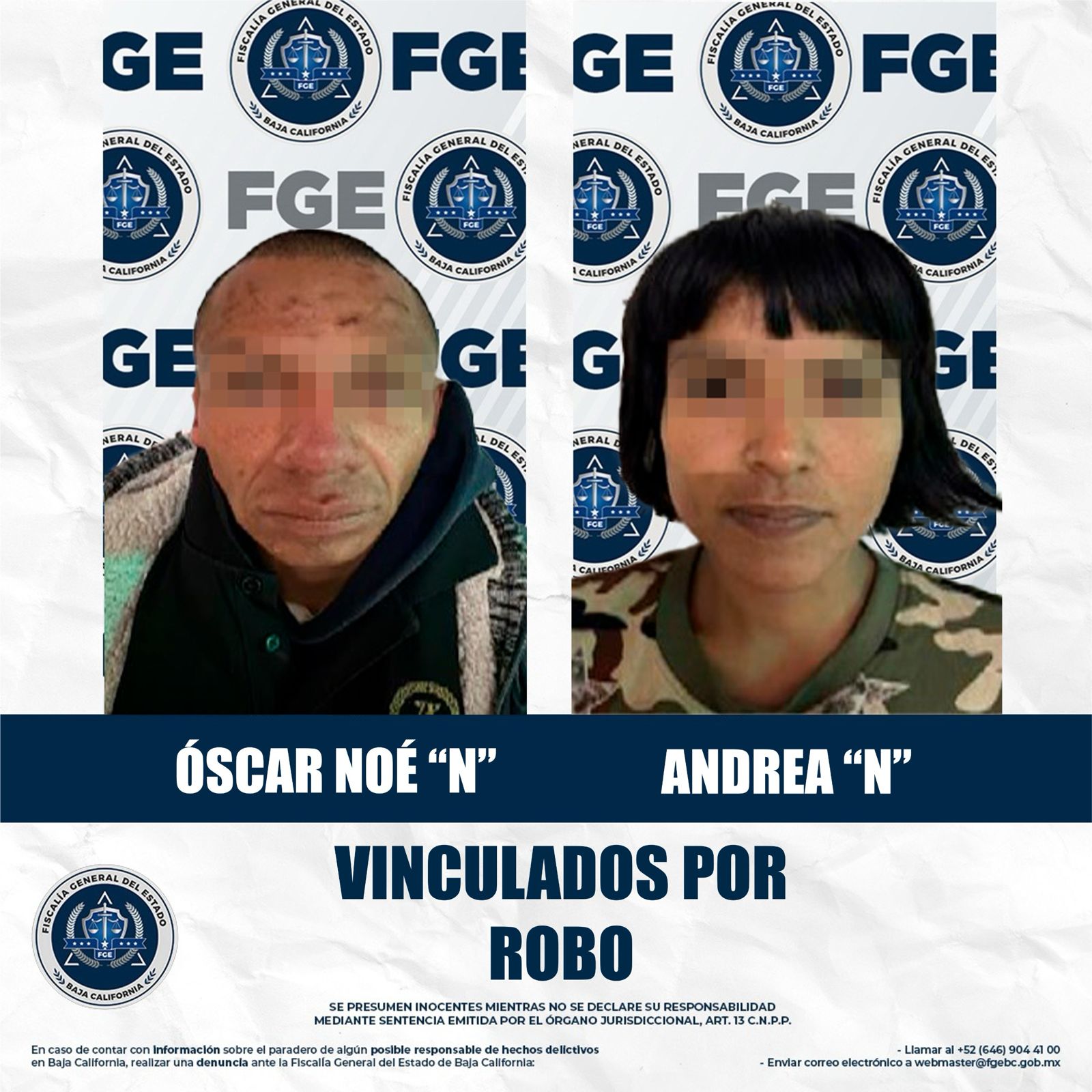 MEXICALI, BAJA CALIFORNIA. - La Fiscalía Regional de Mexicali a través de la Unidad de Investigación de Delitos con Detenidos Oriente obtuvo la vinculación a proceso de un hombre y una mujer por el delito de robo a casa habitación y robo con violencia, durante audiencias realizadas por separado.