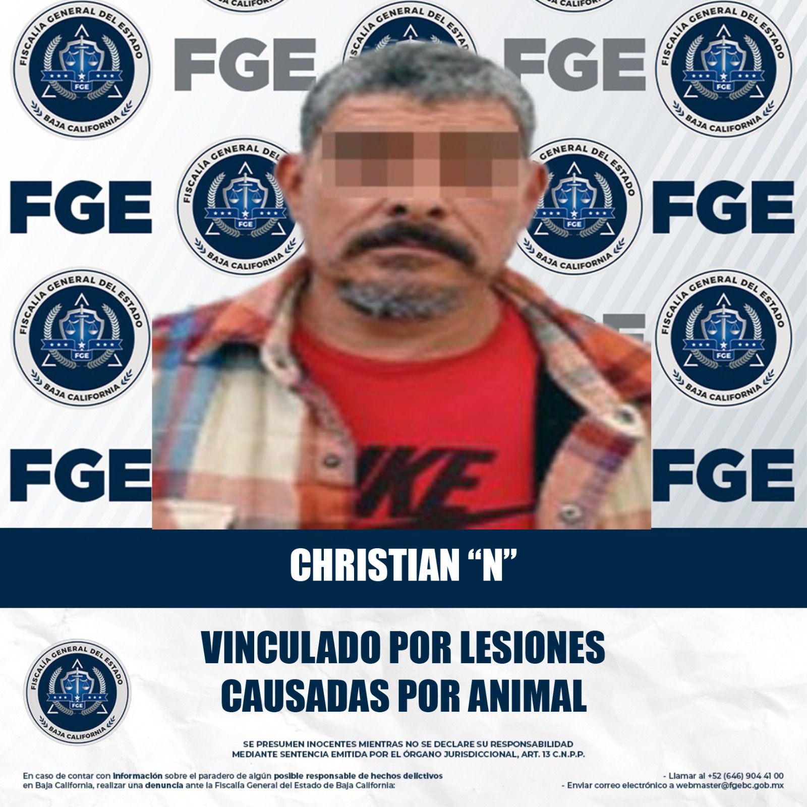MEXICALI, BAJA CALIFORNIA. - La Fiscalía Regional de Mexicali, a través de la Unidad de Investigación de Delitos con Detenidos Poniente, logró la vinculación a proceso de Christian “N” por su probable responsabilidad en el delito de lesiones causadas por animal, en perjuicio de una persona adulta mayor.