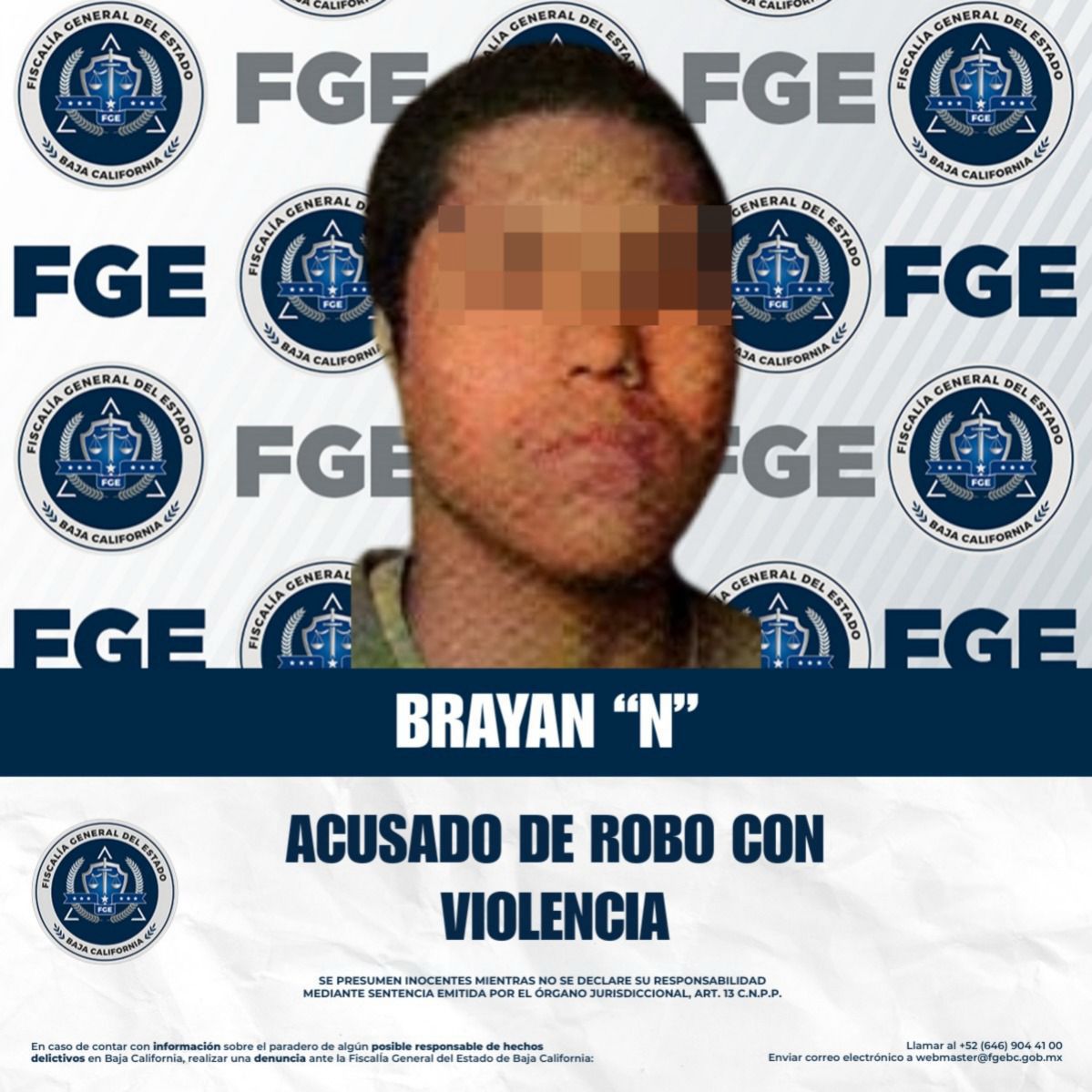 TIJUANA, BAJA CALIFORNIA. - La Fiscalía Regional de Tijuana, a través del Ministerio Público, obtuvo la imposición de la medida cautelar de prisión preventiva en contra de Brayan “N”, por su presunta participación en el delito de robo con violencia.