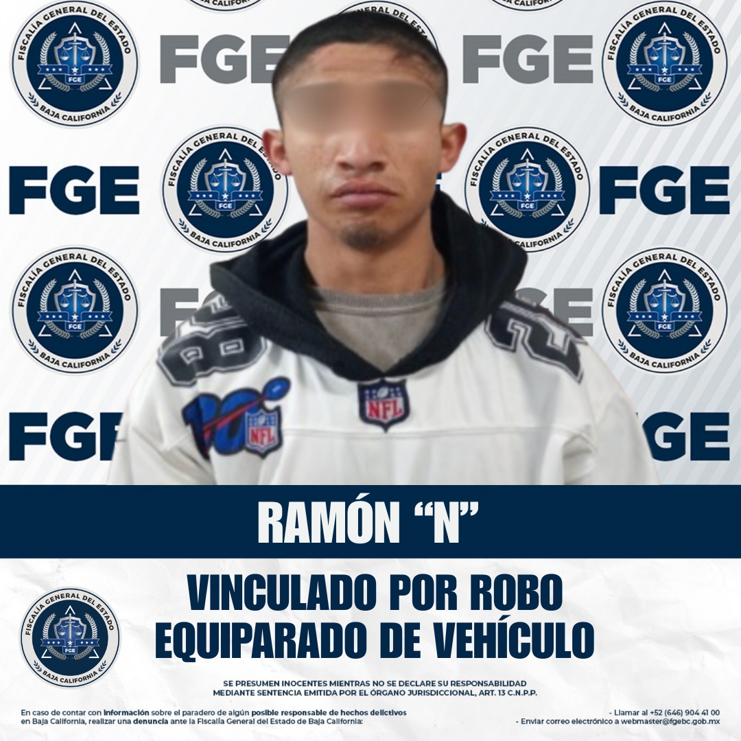 ENSENADA, BAJA CALIFORNIA. - La Fiscalía General del Estado, a través de la Fiscalía Regional de Ensenada y en coordinación con la Unidad de Robo de Vehículos, obtuvo la vinculación a proceso de Ramón “N” por el delito de robo equiparado de vehículo de motor, en su modalidad de uso de vehículo robado, como resultado de labores de investigación y acciones operativas coordinadas.